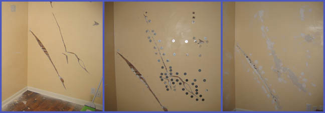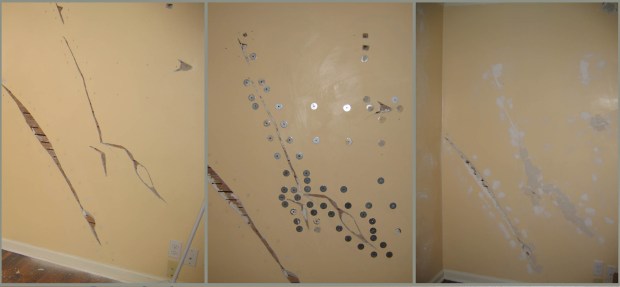 This was the method I used to fix it – I’d drill holes all around the cracks to create pilot holes, fill with caulk adhesive then place a screw with 2 inch washer through plaster layer into lathe, where it would stay for 48 hours, until I unscrewed it, then patched! For the front bedroom alone, I used over 200 screws…I would do about 35 at a time!