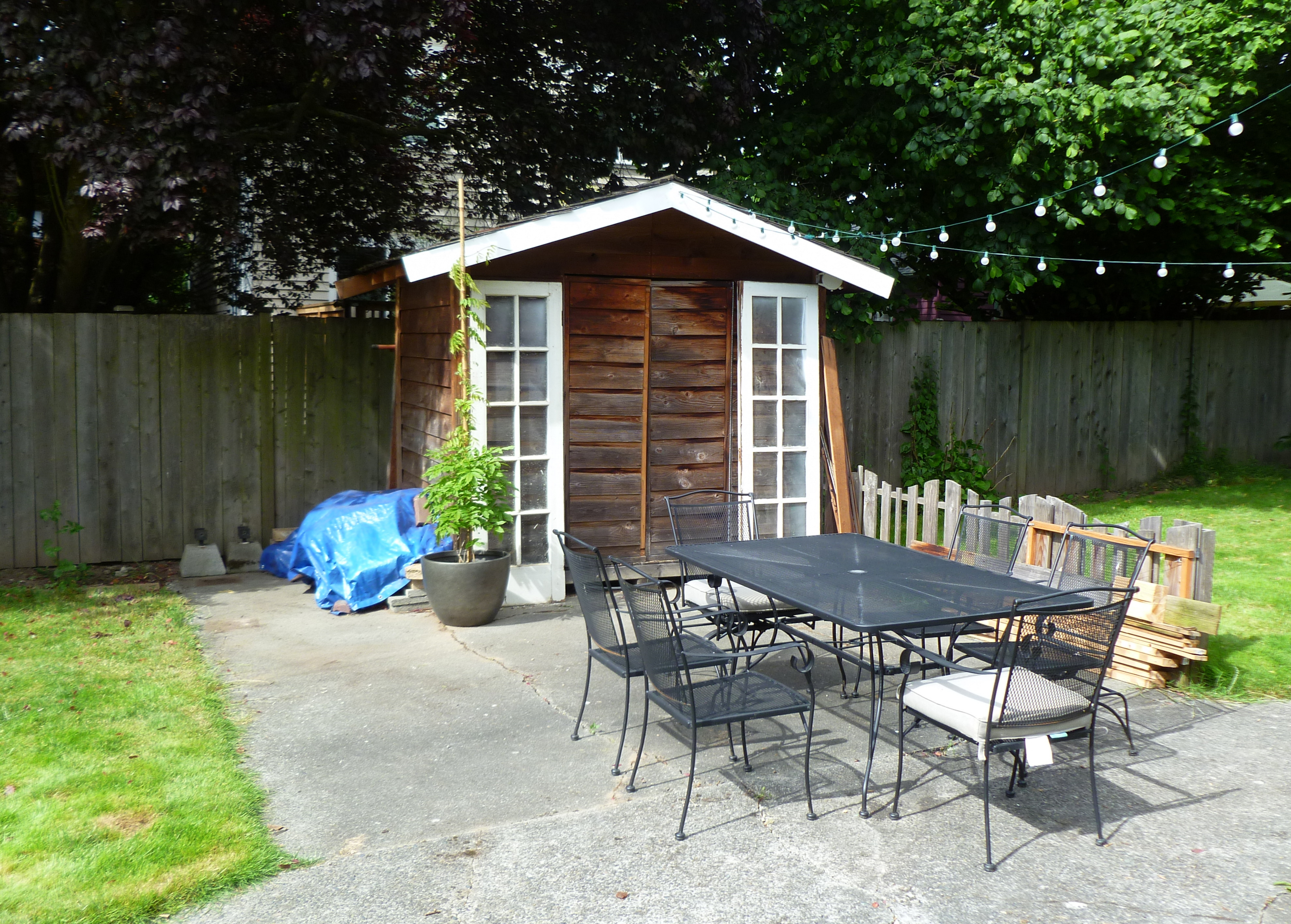 By Sunday evening I demolished the “carport” built on to the side of our little shed.  The trim along the roof frame was completely split, so my plan for Monday was to rip off the old trim and cut and paint new trim.  And of course as soon as I started painting it started raining.  Not pouring, just a few sprinkles, like it just couldn’t make up it’s mind, on and off for hours!  There’s Seattle for you!  But I was determined to get this finished  so every half hour I went out for a new coat.