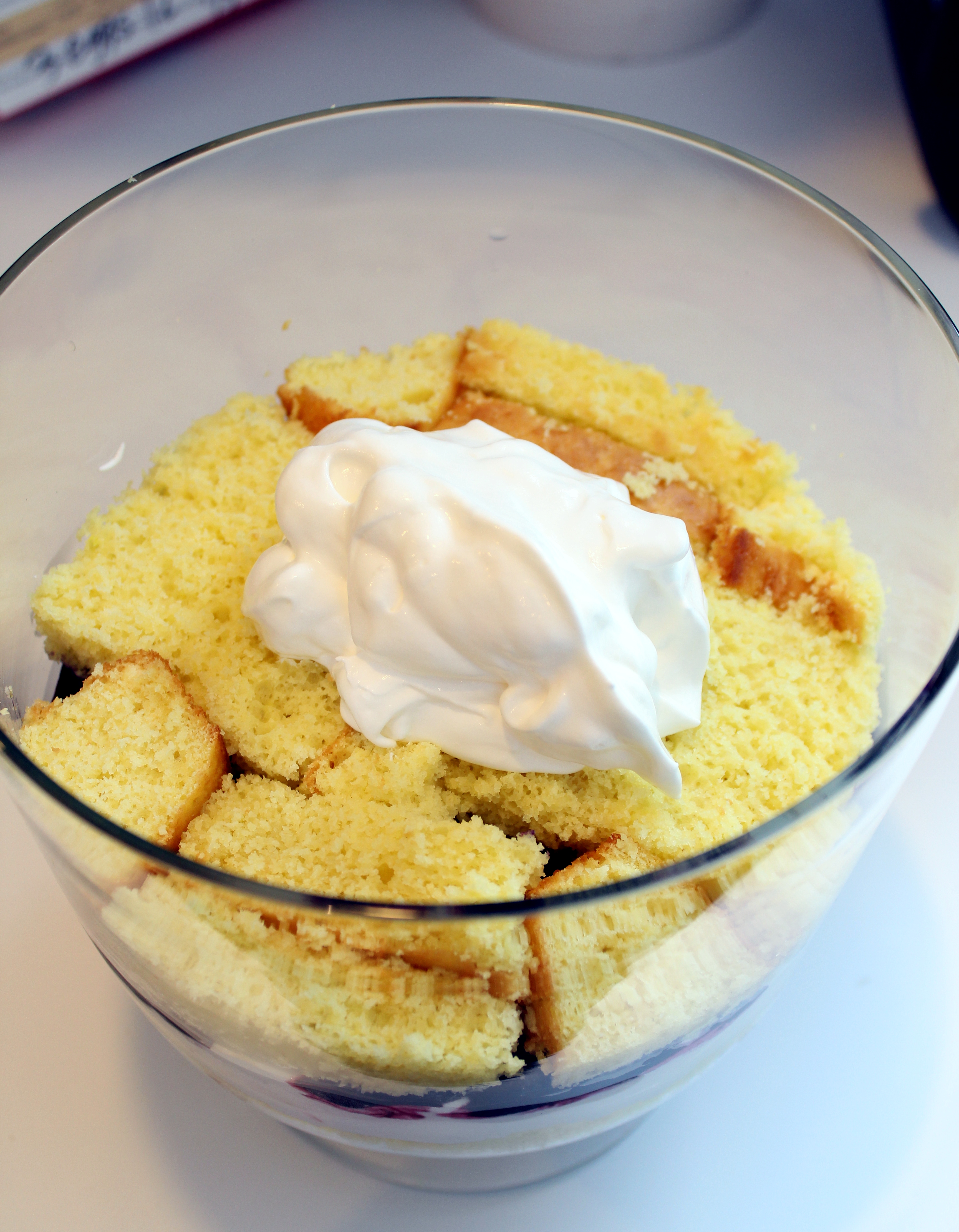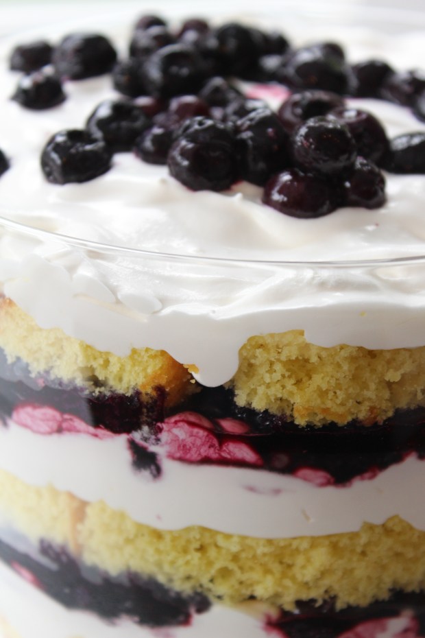 So when 4th of July rolled around and I was in need of a festive red, white, and blue dessert, a trifle was the first thing that popped into my mind! I didn’t own a trifle dish and kept meaning to stop by Bed Bath and Beyond…but each day I drove by, I put it off until the next…and so on. Oh, did I mention I pass it everyday on the way to work? That’s how lazy I am! Before I knew it, it was the 3rd and I hadn’t gotten a trifle dish…so I gave into my laziness and decided I would just make a cake, frost it white, and throw some berries on the top. I don’t have the patience to decorate a cake with the American flag so 2 colors was going to be as festive as I was going to get.