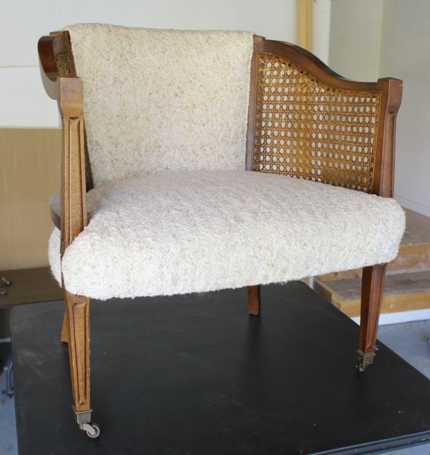 Last year I picked up 2 caned club chairs off of craig’s list to hone my re-upholstery skills . I immediately fell in love with their barrel backs and caned arms. Turns out it was pretty fortunate that they had neutral fabric since they have managed to sit in our house for quite some time! I couldn’t come up with a plan of action, until now! My goal is to post each week step by step until it’s complete! Hopefully this will keep me accountable! We’ll see!
