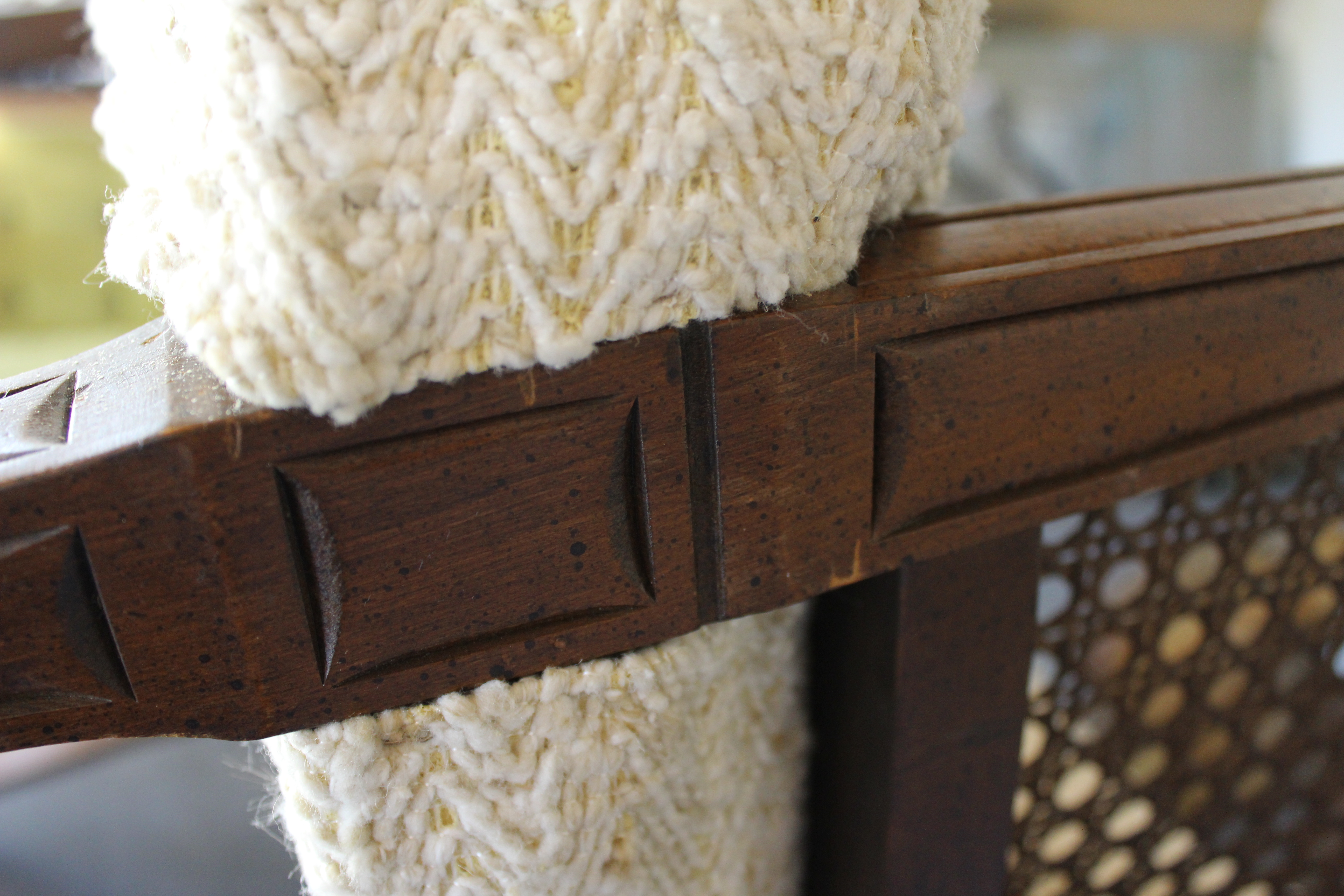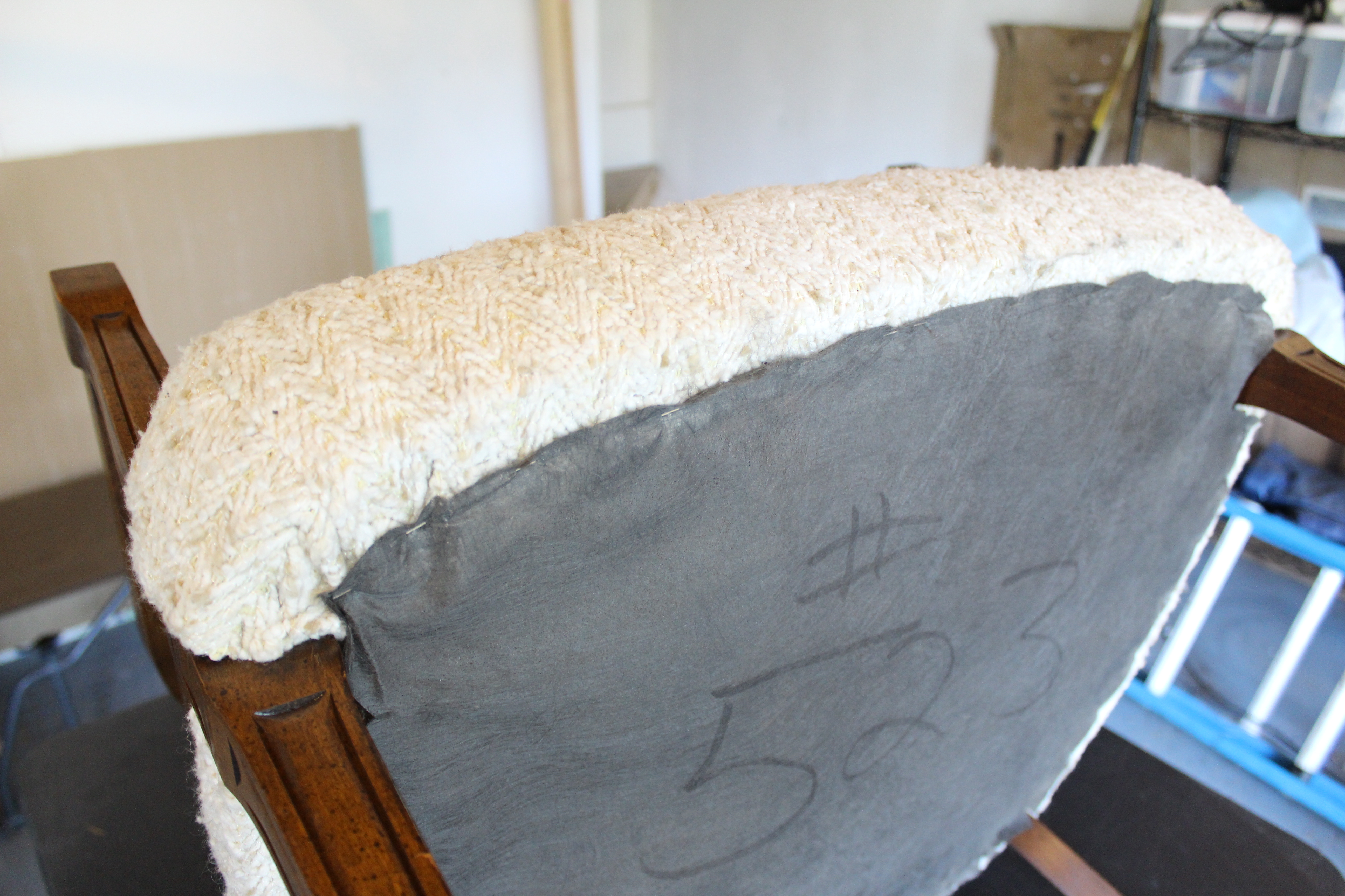 Like the chair legs, the staples were visible along the sides of the front back cushion, so again I used extra caution not to damage the wood. From the looks of the back cushion, this wasn’t the first time the chair was upholstered. Somewhere in a previous life the chair was tufted with 14 back buttons and 31 seat buttons. That’ intense! I’m opting not to tuft this chair.