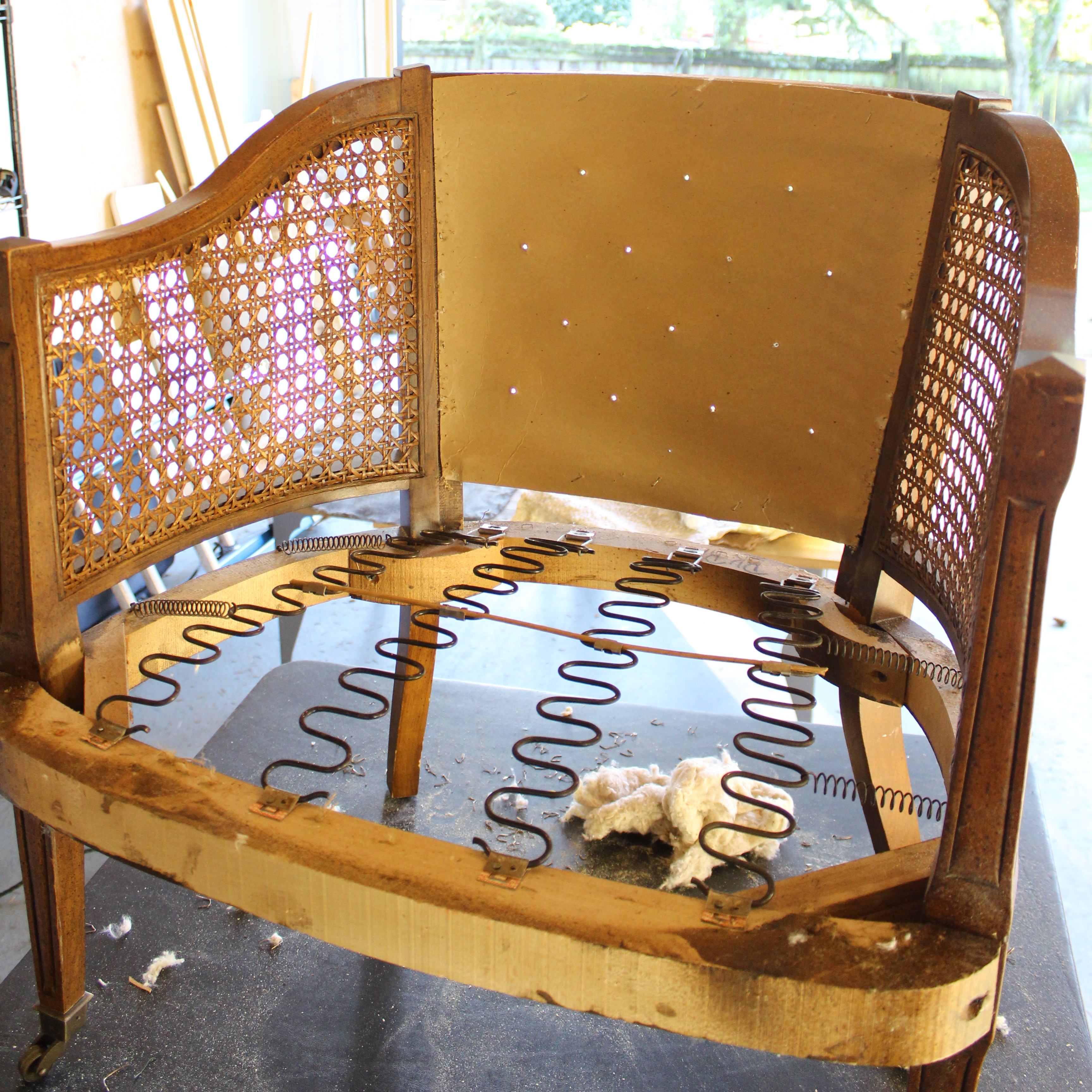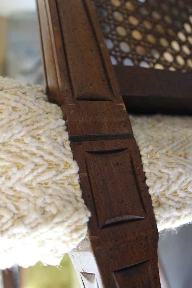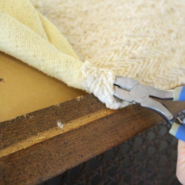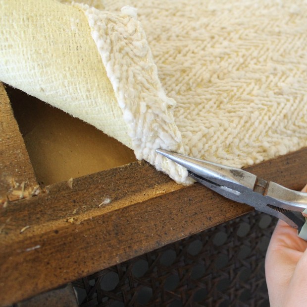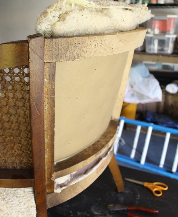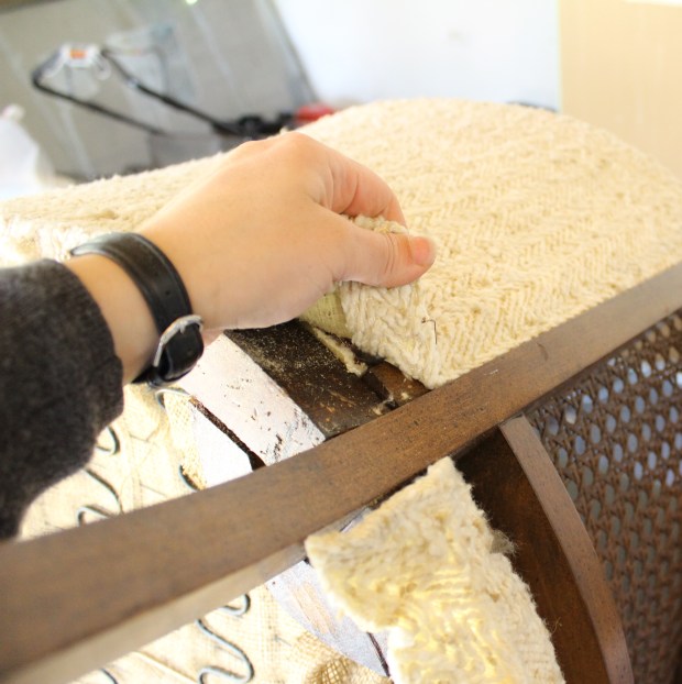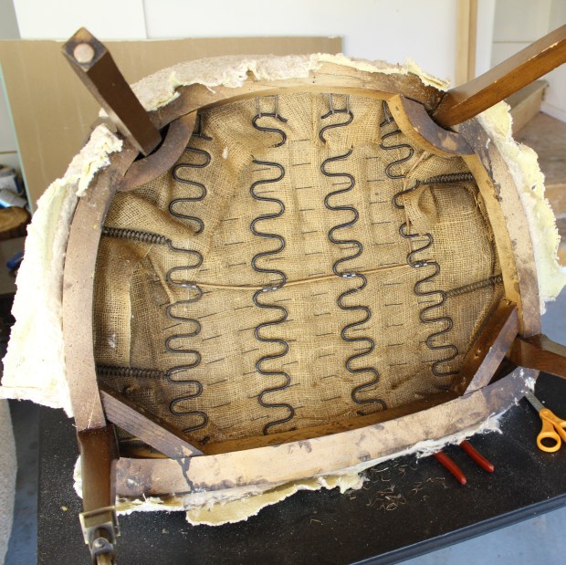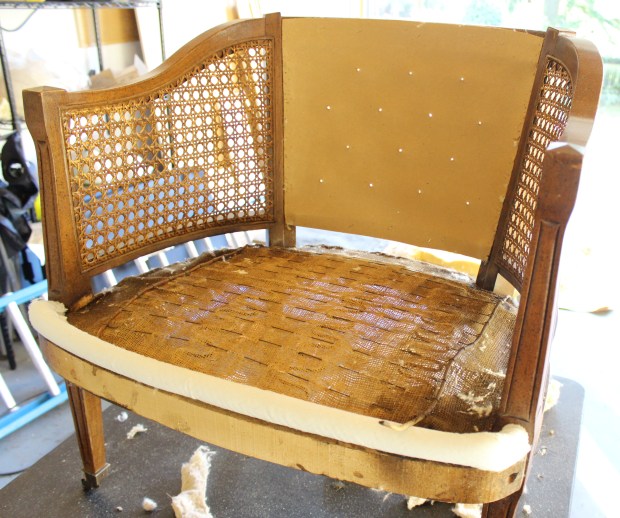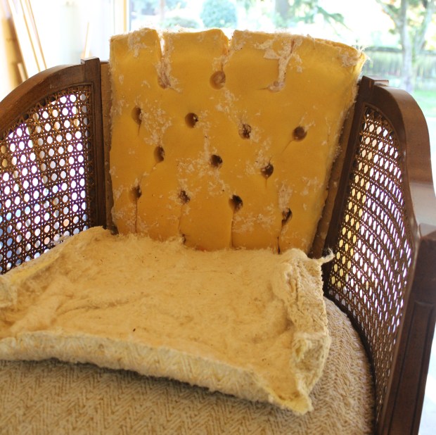Once you get to these end stages, a lot of the structural elements can be left or replaced. In this case, I am removing the burlap over the seat cushions for 2 reasons. 1 – I am painting the frame, so it seemed to make sense, and 2 – it was pretty dirty and dusty. I’d rather it be clean. In some cases I have reused the foam cushions, but it all depends on the condition that they are in. Last year I re did a chair that had straw for cushioning. Obviously I didn’t reuse that :)