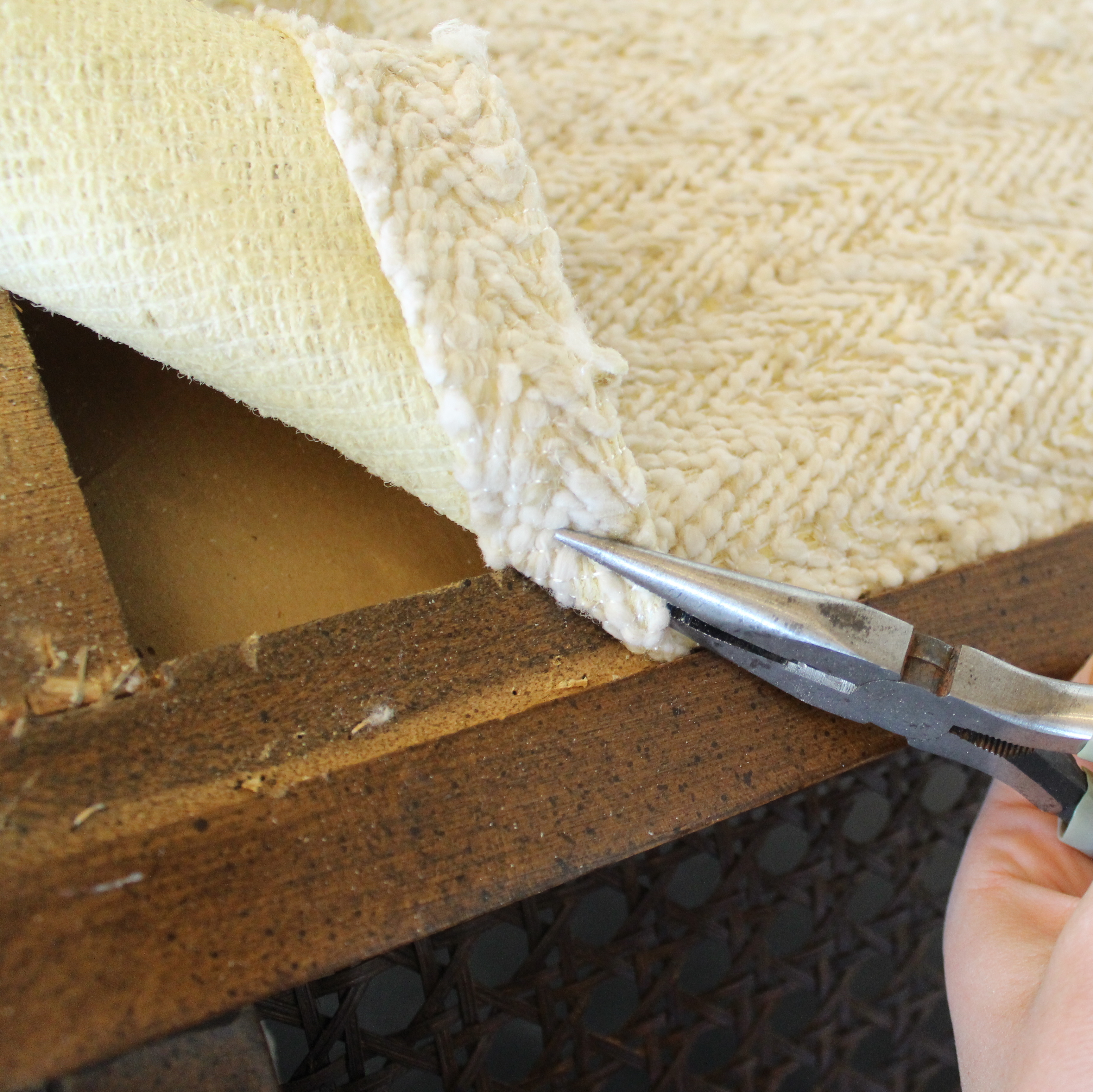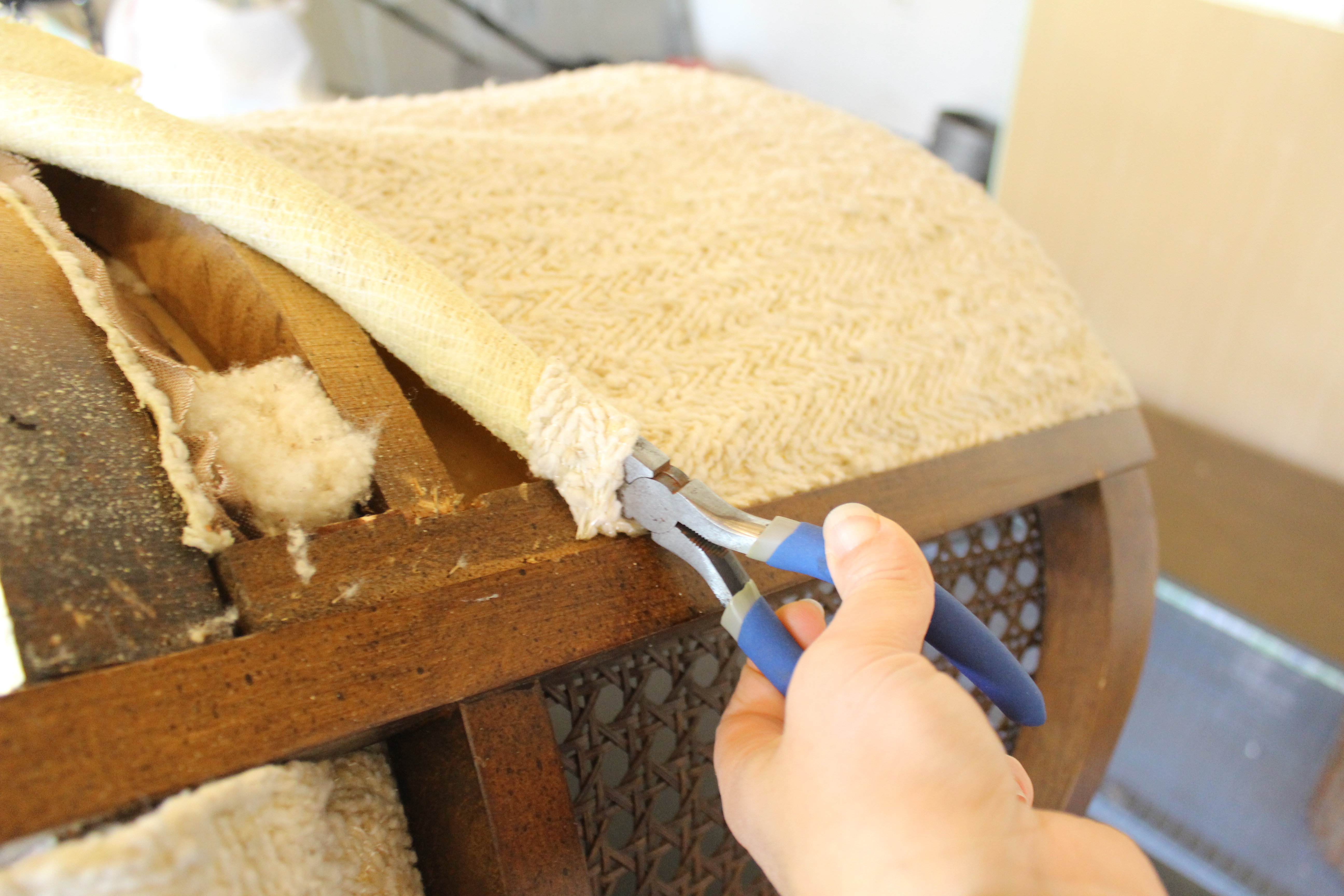 Start at the bottom removing the dust cover. That’s where the staples are exposed and it’s the easiest place to start. I use a pair of needle nose pliers and snips, working my way around the chair prying out the staples.