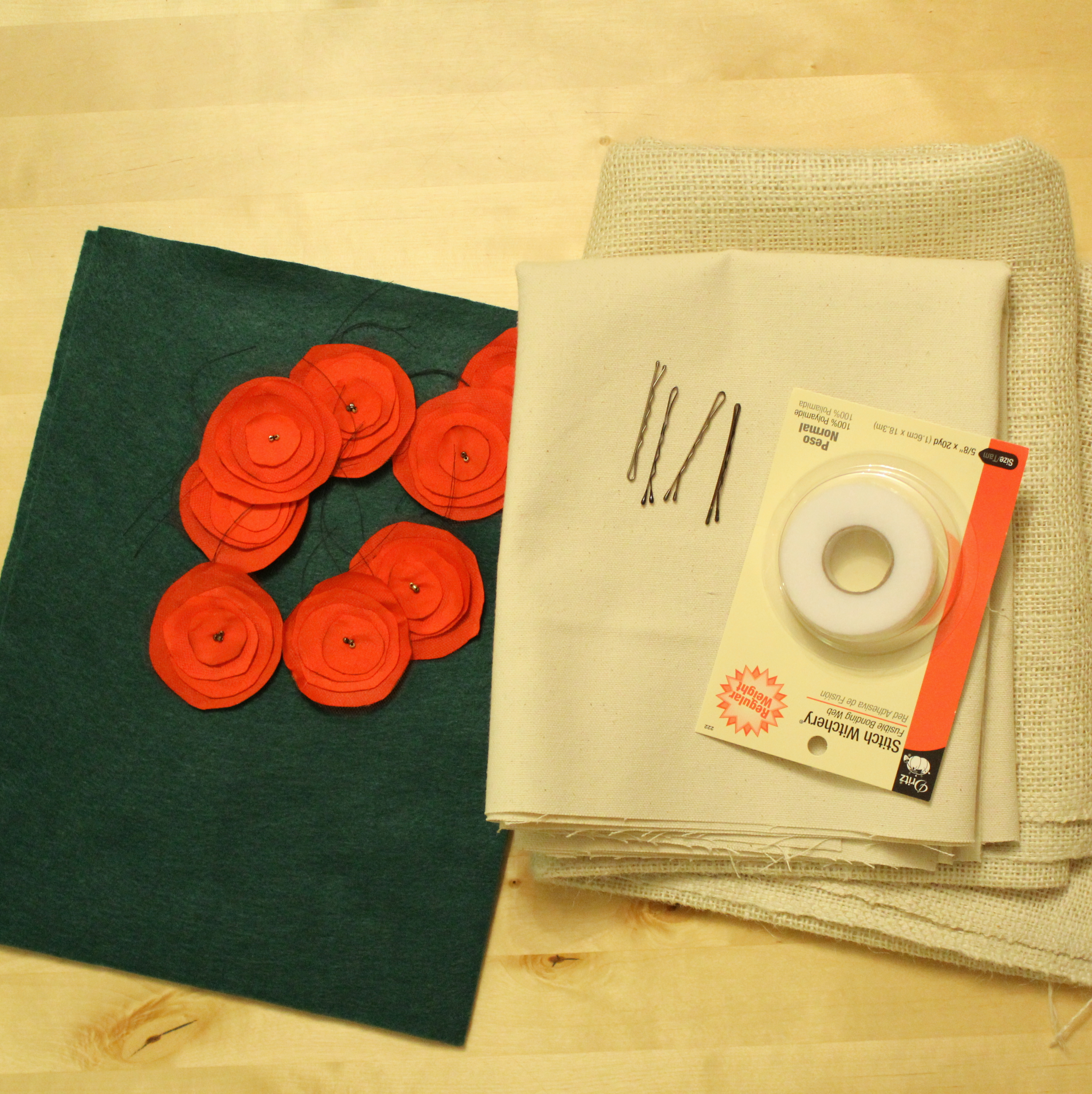 For Supplies I used: 1/2 yard cream canvas, 1/2 yard cream burlap, (1) 8×10 sheet of green felt, (4) bobby pins, heatnbond tape, and (4) red flowers. (Flowers DIY’d here), and scissors, iron, sewing machine, needle, and thread.