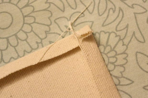 I pulled out the sewing machine and sewed a straight line about 1/4 inch from the edge of the canvas. I decided to leave the burlap uncut until after all the edges were sewn to keep them from unraveling.