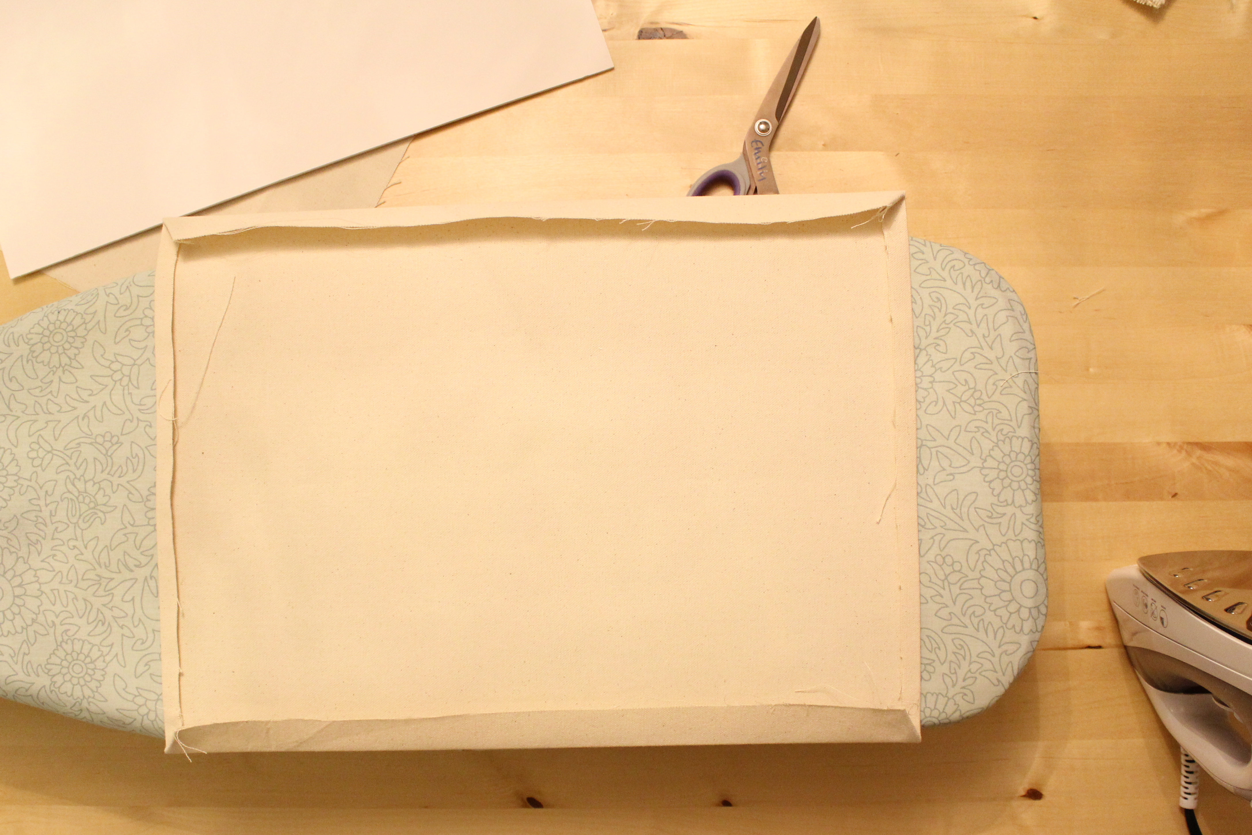 Once all the stripes were ironed around the edges, I waited for them to cool, and removed the paper backing. Then I ironed the burlap onto the folded side of the canvas, making sure to get a lot of heat around the edges and corners.