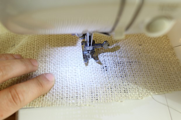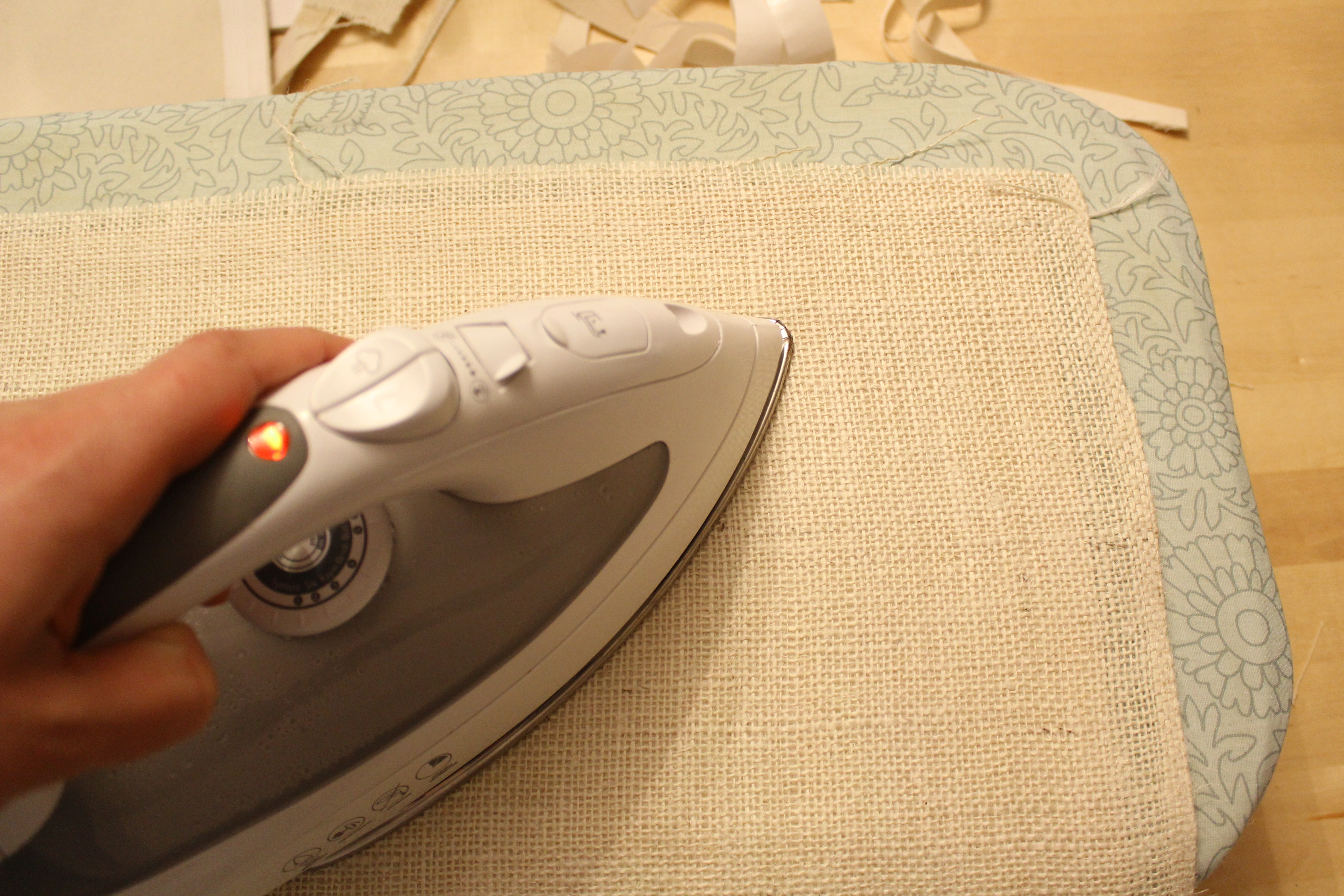 Once all the edges were folded in, I ironed heatnbond tape along the hem to secure it. Side note: Originally I did this in hopes that I could then just iron on the burlap, and completely skip the sewing machine, but the fabrics were too thick and the heatnbond strips didn’t hold well. It was nice though when sewing to have them held in place so I didn’t have to adjust everything while sewing.