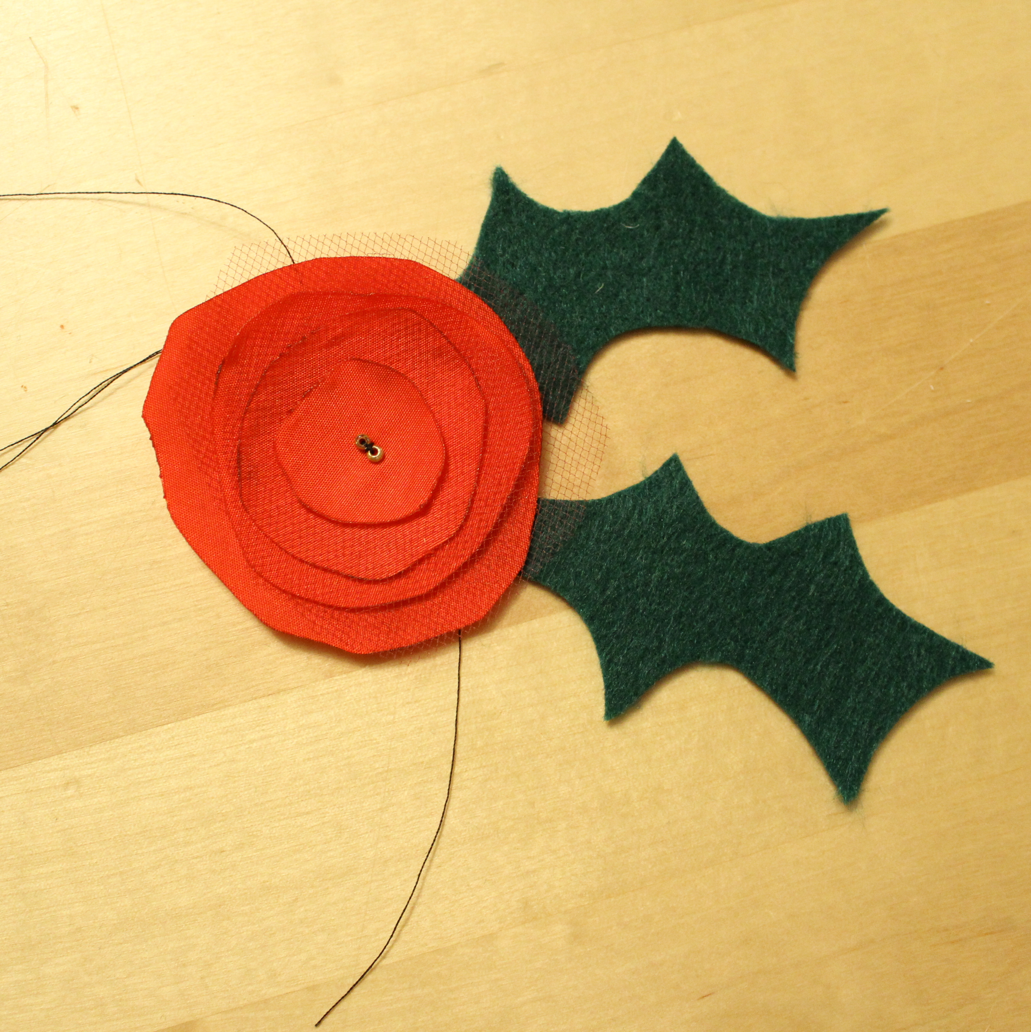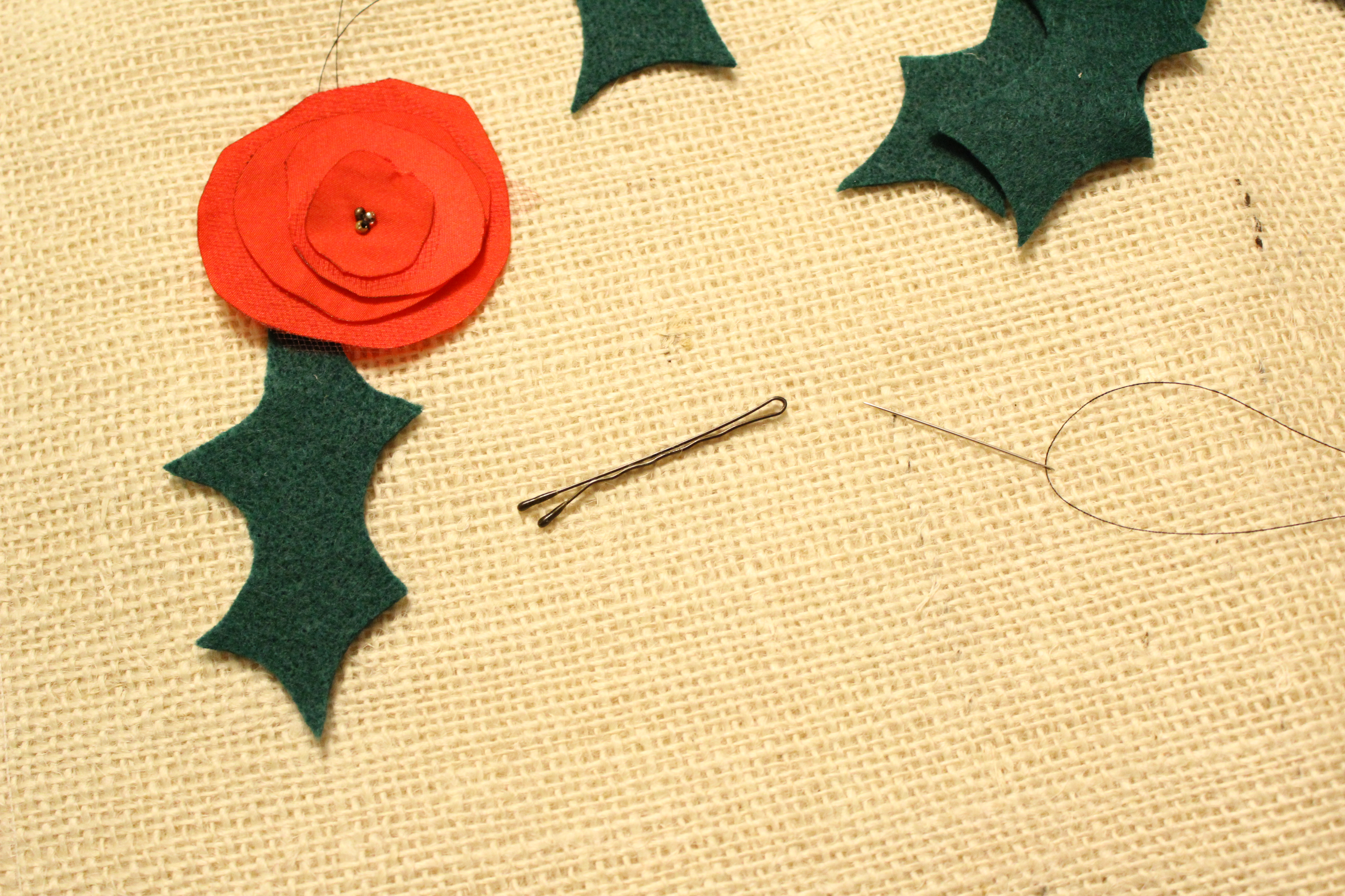 Using a needle and black thread sew the holly leaves, red flower, and bobby pin together. Red flower on top, 2 holly leaves positioned at about 45-90 degrees apart from each other, and the bobby pin on the bottom. Try to keep the bobby pin directly underneath a holly leaf so that it isn’t visible from the top.