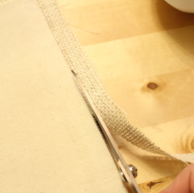 I started out by cutting my canvas and burlap down to size. I cut it about 1/2 to 1 inch larger than a placemat that I had on hand.