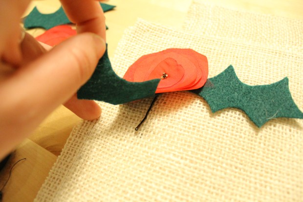 Then once that is finished, the holly leaf flower can be pinned into the burlap! I chose to go with bobby pins so I can remove them and pin them with something else depending on the season! Interchangeable!