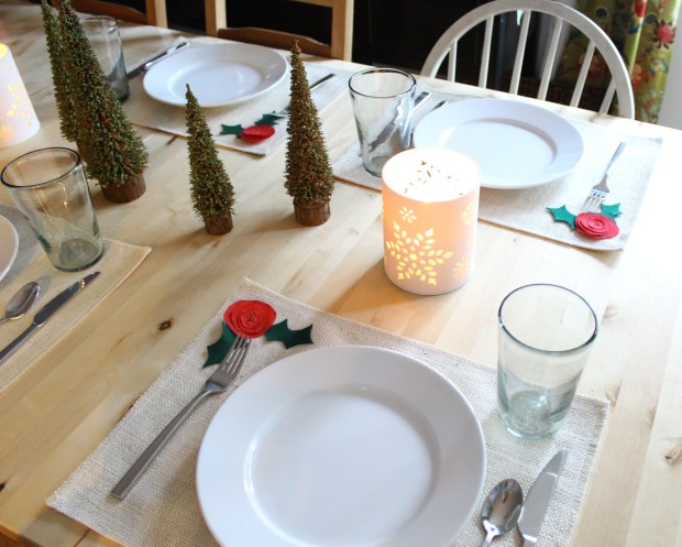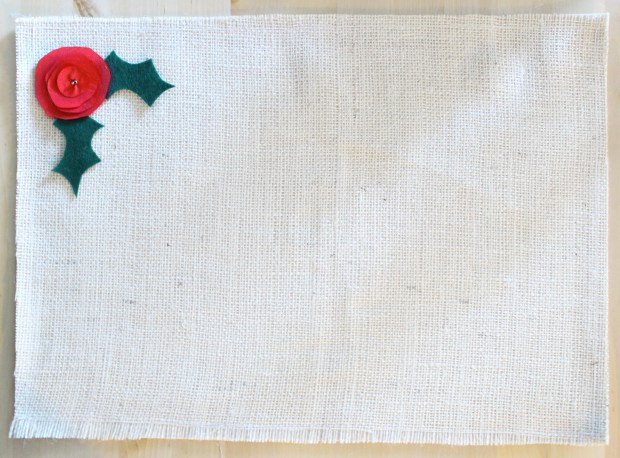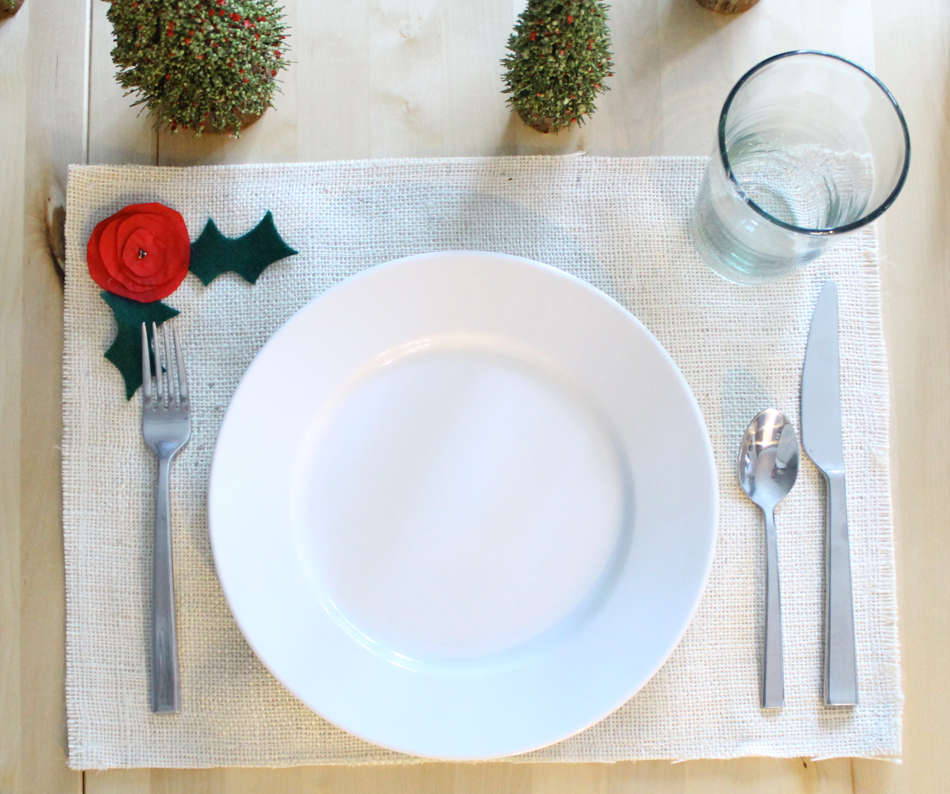 I cut out rough holly leaf shapes in cardstock to use as a pattern when cutting the felt. I cut out 8 holly leaves, 2 for each placemat.