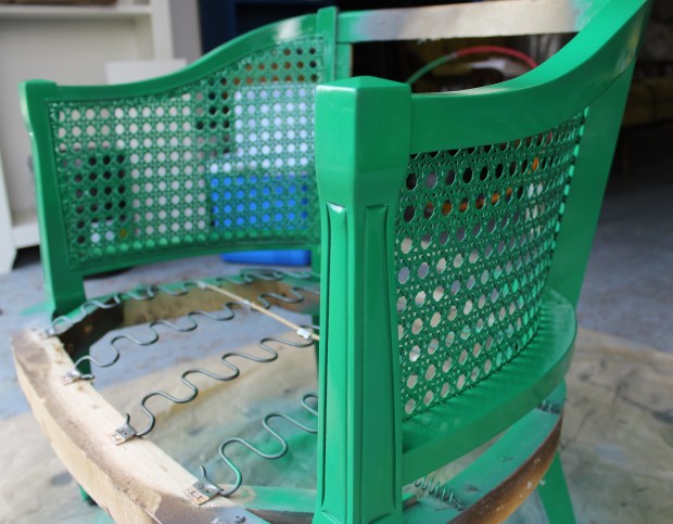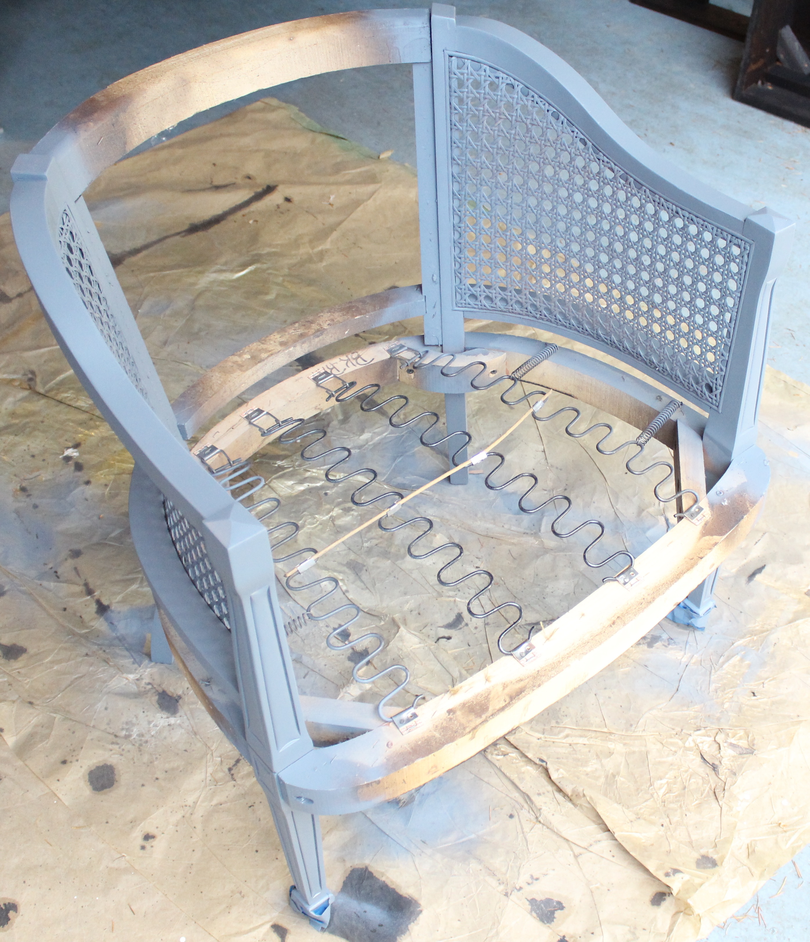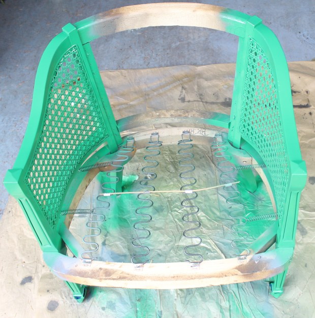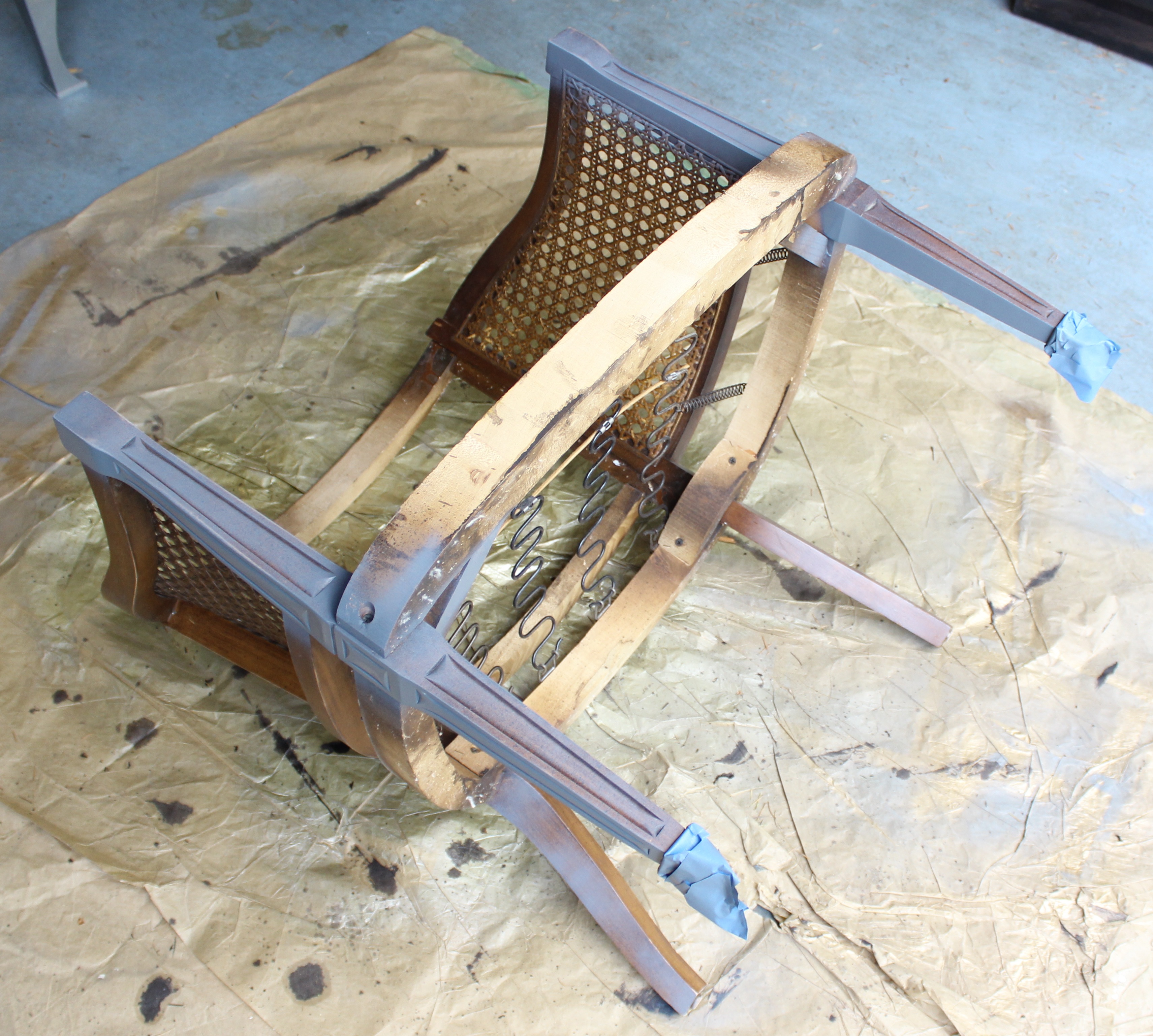 I taped up the casters and started priming. I used a spray because of the caning. The spray does lighter coats than a brush and can get into all the little over-under spots in the weave.
