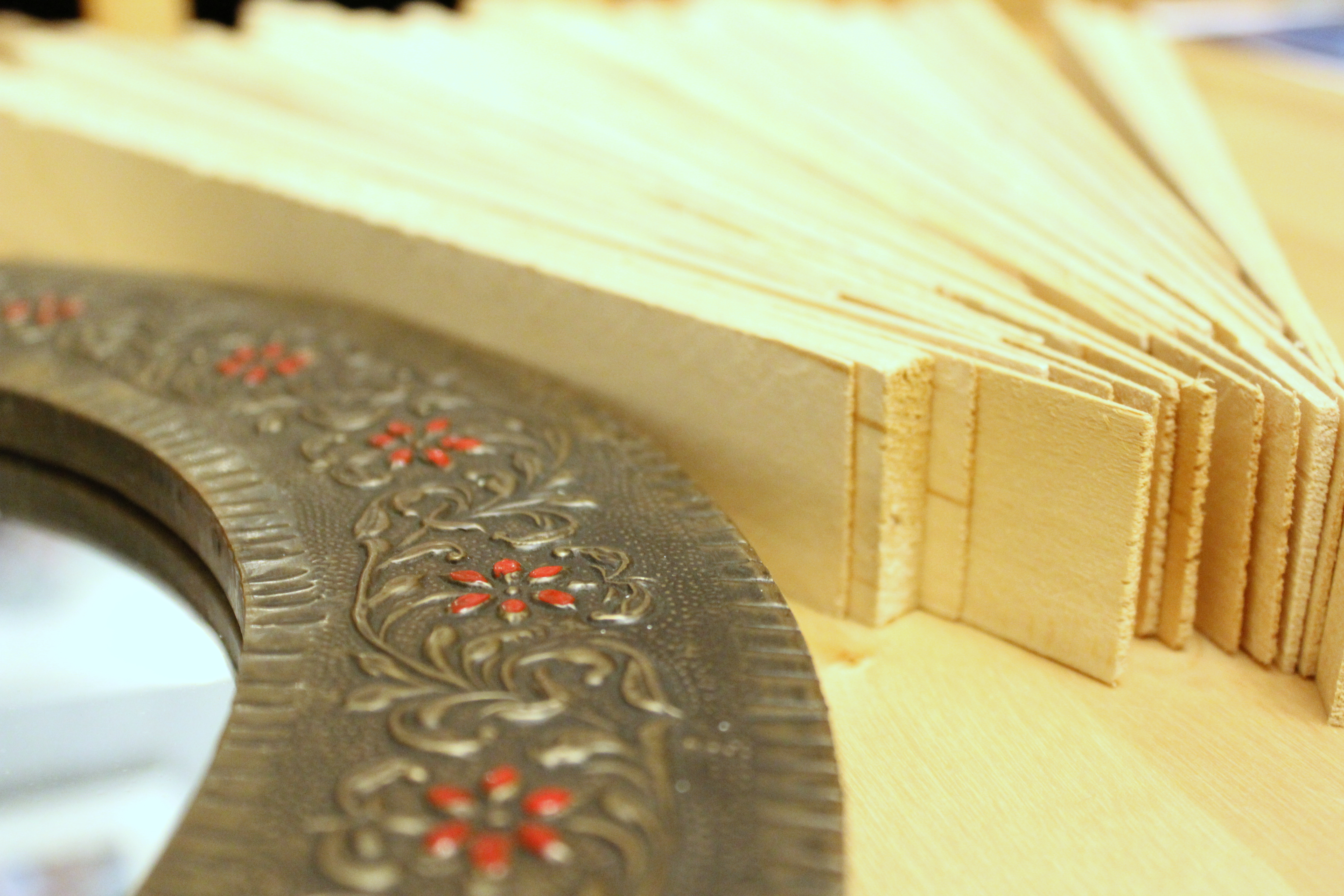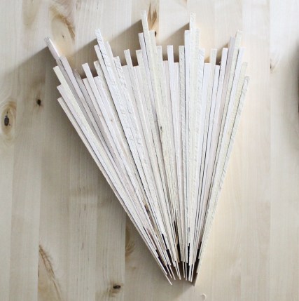 The shims were about twice the height of the mirror, so I decided to slice each one in half using a metal ruler and an exacto knife. This took me about 2 hours, and I only had 1 pack of shims…which gave me about half of the mirror covered in bursts.