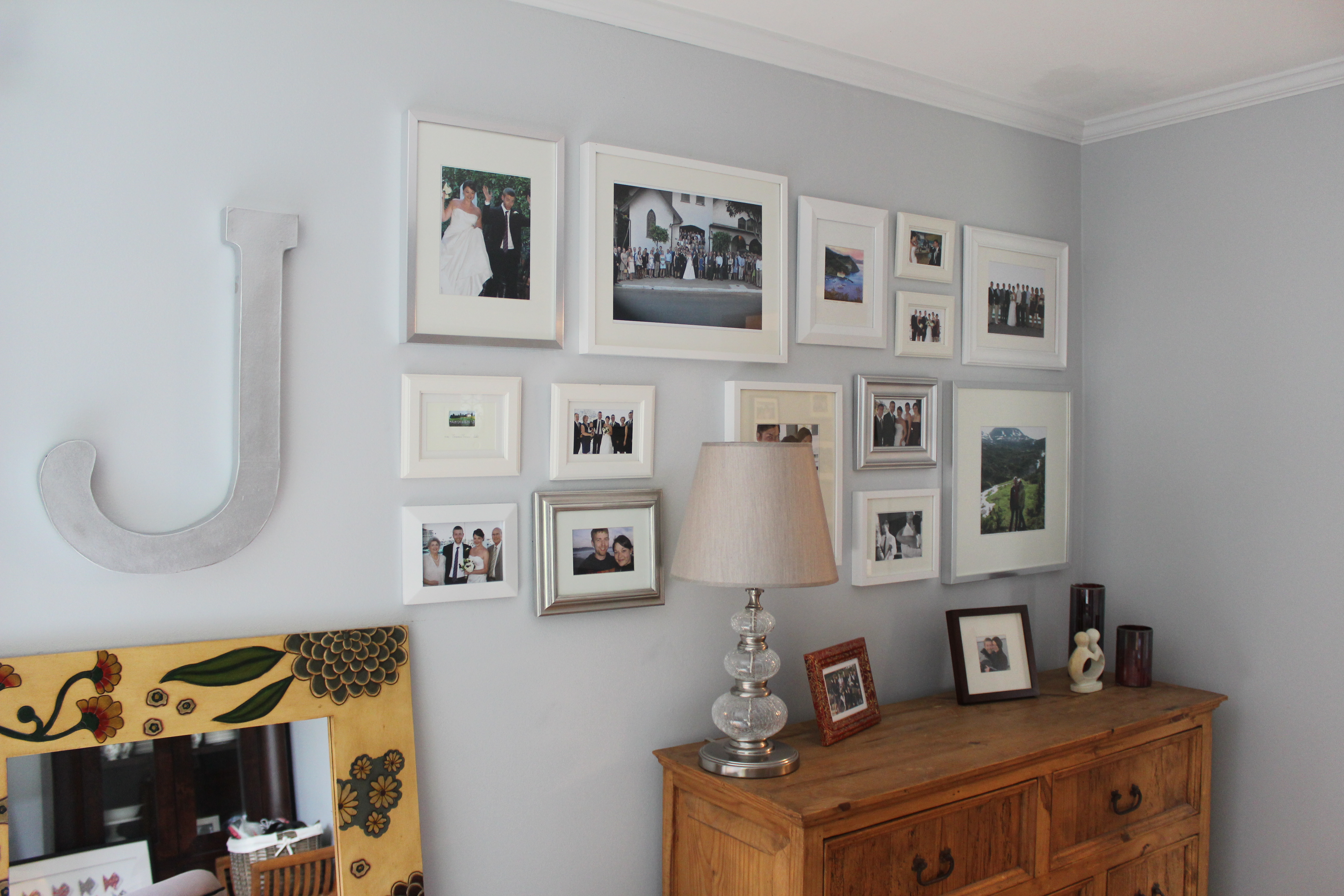 The gallery wall didn’t extend all the way to the door…I wasn’t totally sure what to do with the extra space, but then I came across this cardboard J at Michaels, spray painted it silver and put it up.