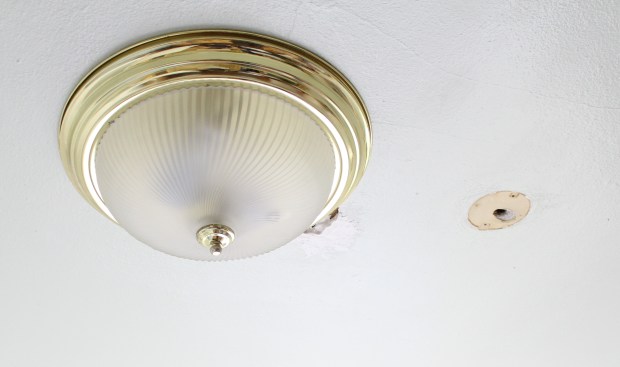 I wish I could say that the bedroom just needed new paint on the walls.  But not only does it need paint on the walls, it also needs it on the ceiling.  But before we can paint the ceiling, I have to finish patching it.  When we first bought our house in fall 2009 we ended up having the whole electrical system updated, which left us with over 40 holes around the house that required patching.  This room I left because it wasn’t used much.  I had most of the holes dealt with but needed to finish the ceiling before painting.  This is how the ceiling started out last week.  I knew that there was a little area that was going to need my attention under the flush mount ceiling light.