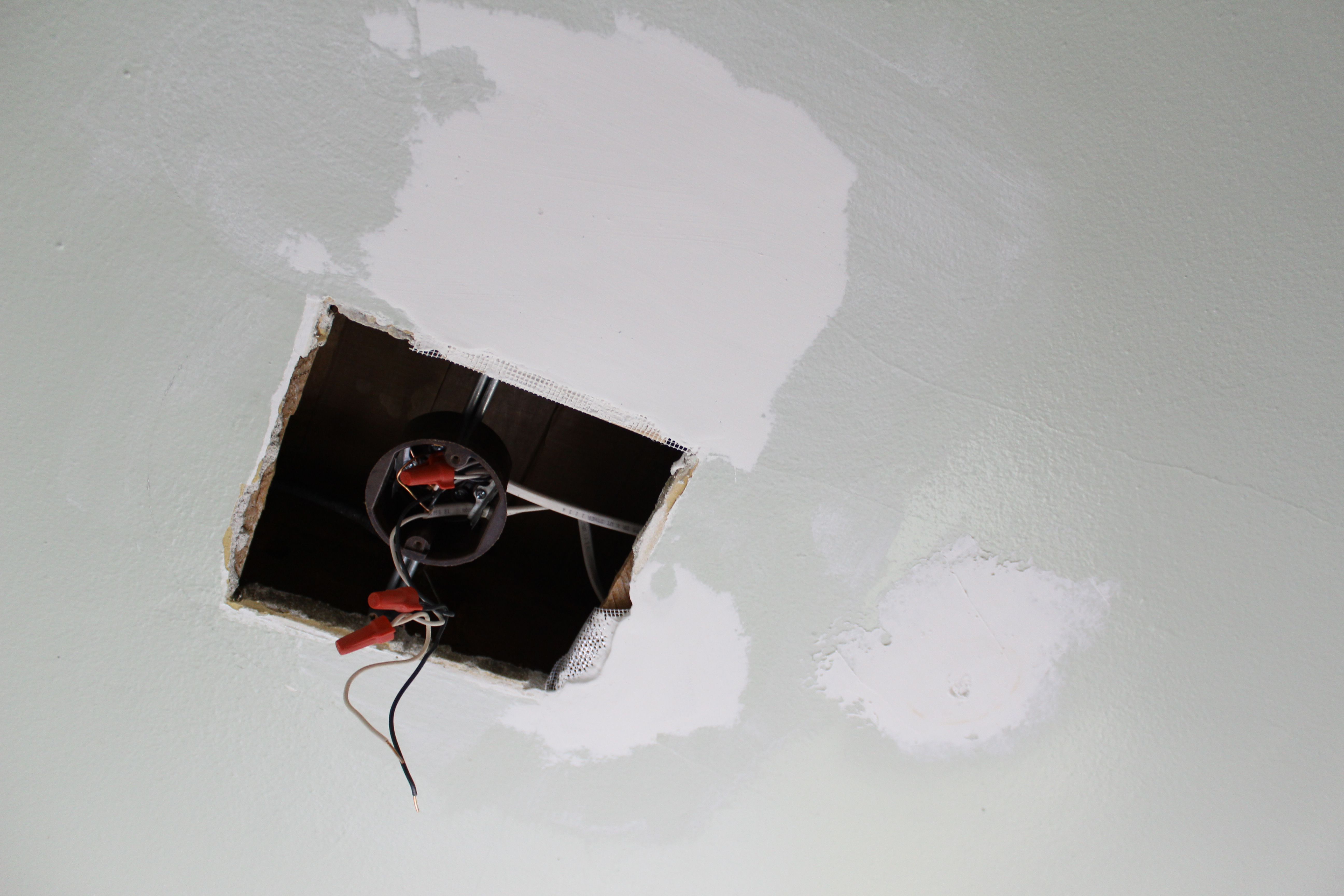 I decided to put the patching on hold for a week while I wait for the new light fixture to arrive.  It is a flush mount, but the diameter is smaller than the hole, so I am going to have to figure out a way to stabilize everything and patch inward.  I figured waiting for the fixture would be a a nice break and then I can double check all the measurements once it arrives.