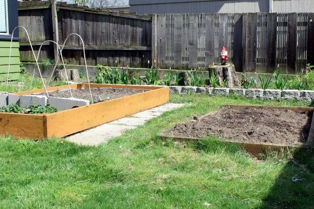 Originally we were going to build a matching large bed to sit next to this one.  But the days are getting away from us, and I have had my little seedlings in the garage and they have out grown their mini pots.  It was either let them die or get them a garden pronto!  And with our next month of weekends being filled by 30th Birthdays (mine!!), weddings, and baby showers it has became obvious to me that we aren’t going to be building a new raised bed…so next best thing, I cleaned up the one that we already had!