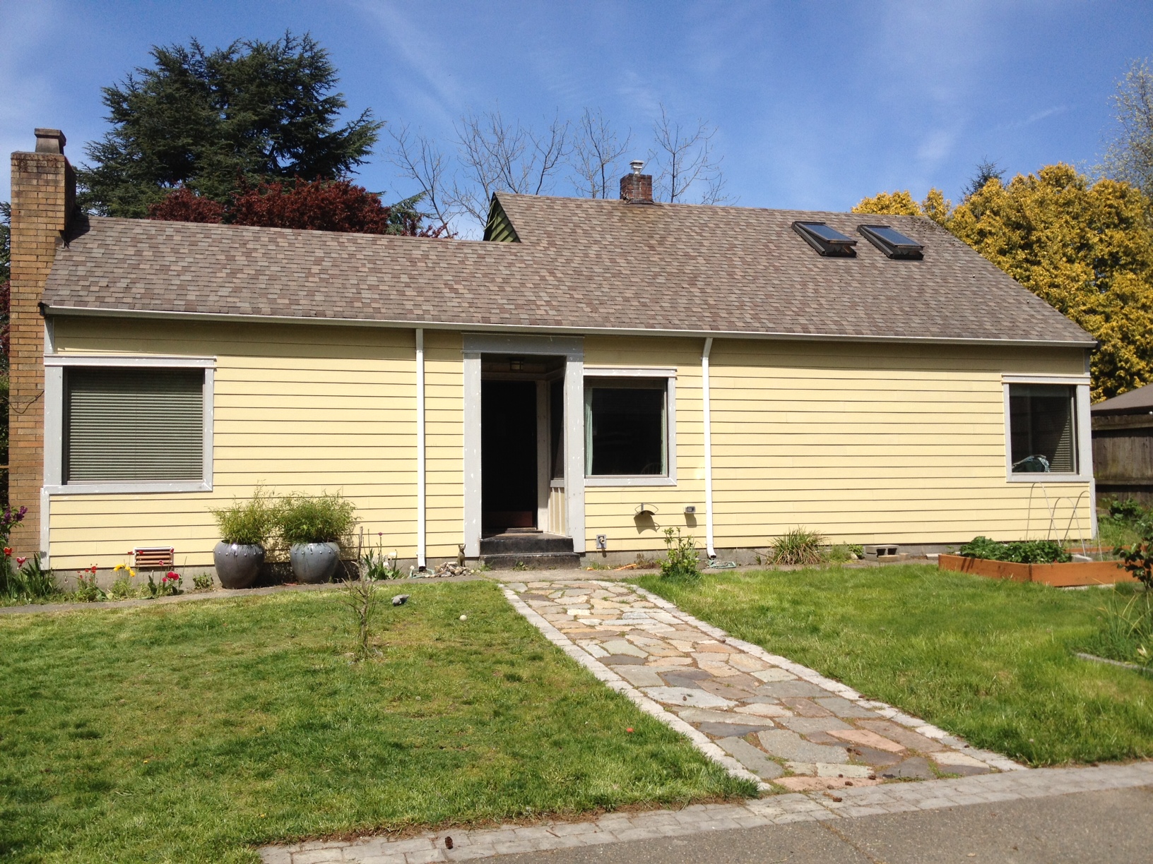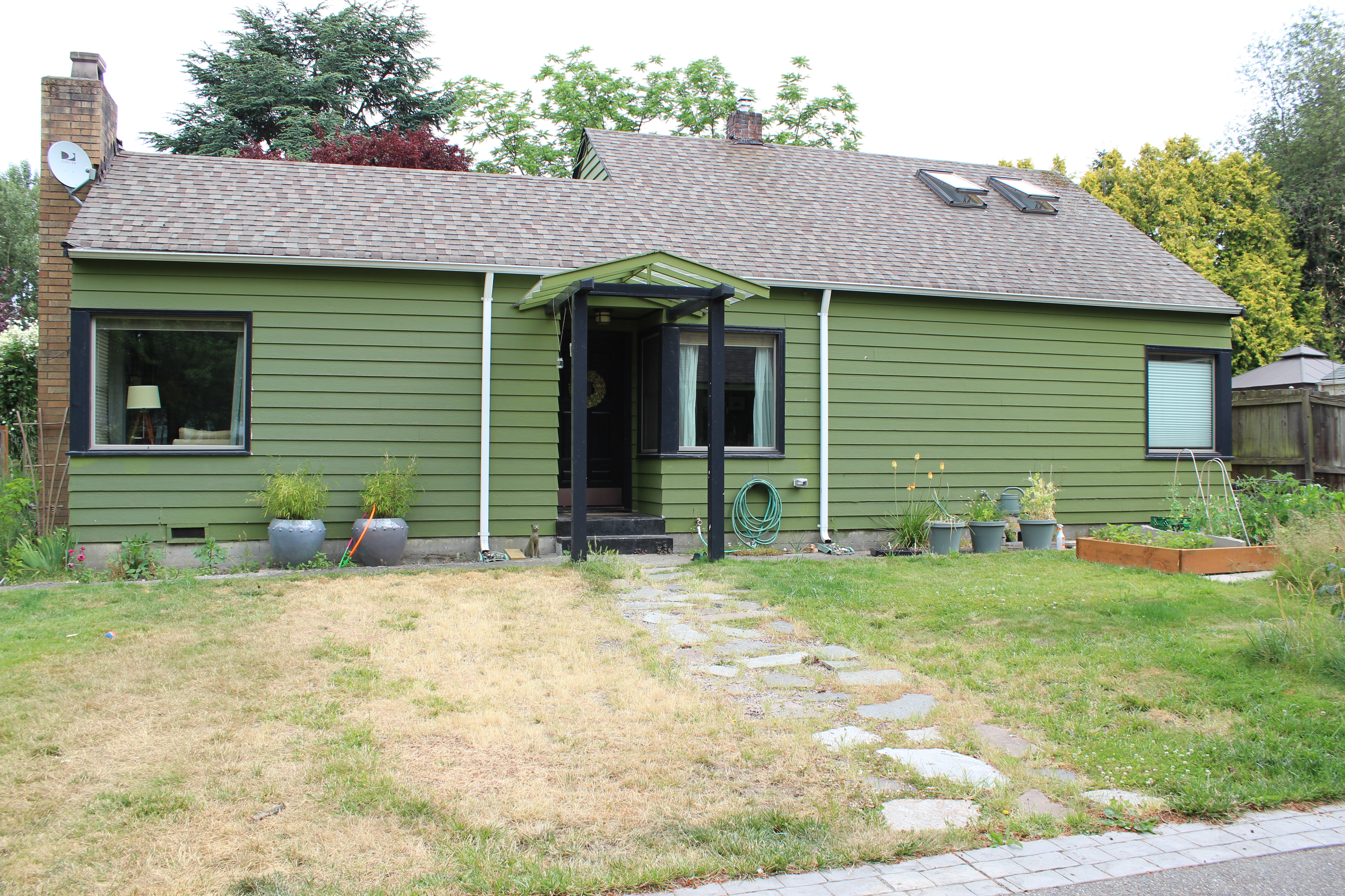Now, my only issue is that I think the light yellow looks so much better than the dark green that I don’t feel the strong motivation to get quotes from painters…though I know I really need to! I feel like if I am this excited about one side of the house being half way complete, I will be VERY happy when all sides are complete! Plus I can’t get the taller cedar trees until the house is painted. And also, I look forward to not having the gutter drains be a contrasting color. Thought I still need to figure out how to tackle the large wall between the windows on the left.