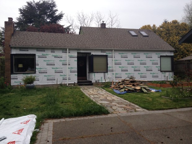 Luckily though by 6, when I arrived home after work, the house looked like this. I know it’s just house wrap, but it just looks so much better, like something good is about to happen. :)