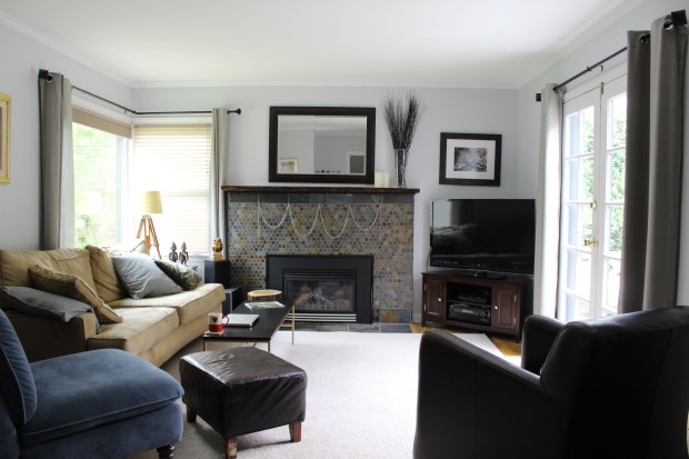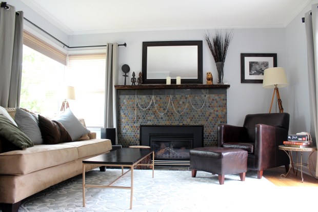 I have to admit, I cheated a bit. The rug isn’t my perfect dream rug, but it’s been great! Turns out my parents were getting a new area rug for their living room so generously donated their old one to us. It’s that perfect hide everything color which is exactly what we need…it’s already had a whole glass of red wine spilled on it, and you can’t even tell. (wasn’t me!) I was a little nervous about the color and how it would go, but honestly it works so well, better than I could have imagined. It’s almost the exact same color as the grout on the fireplace.