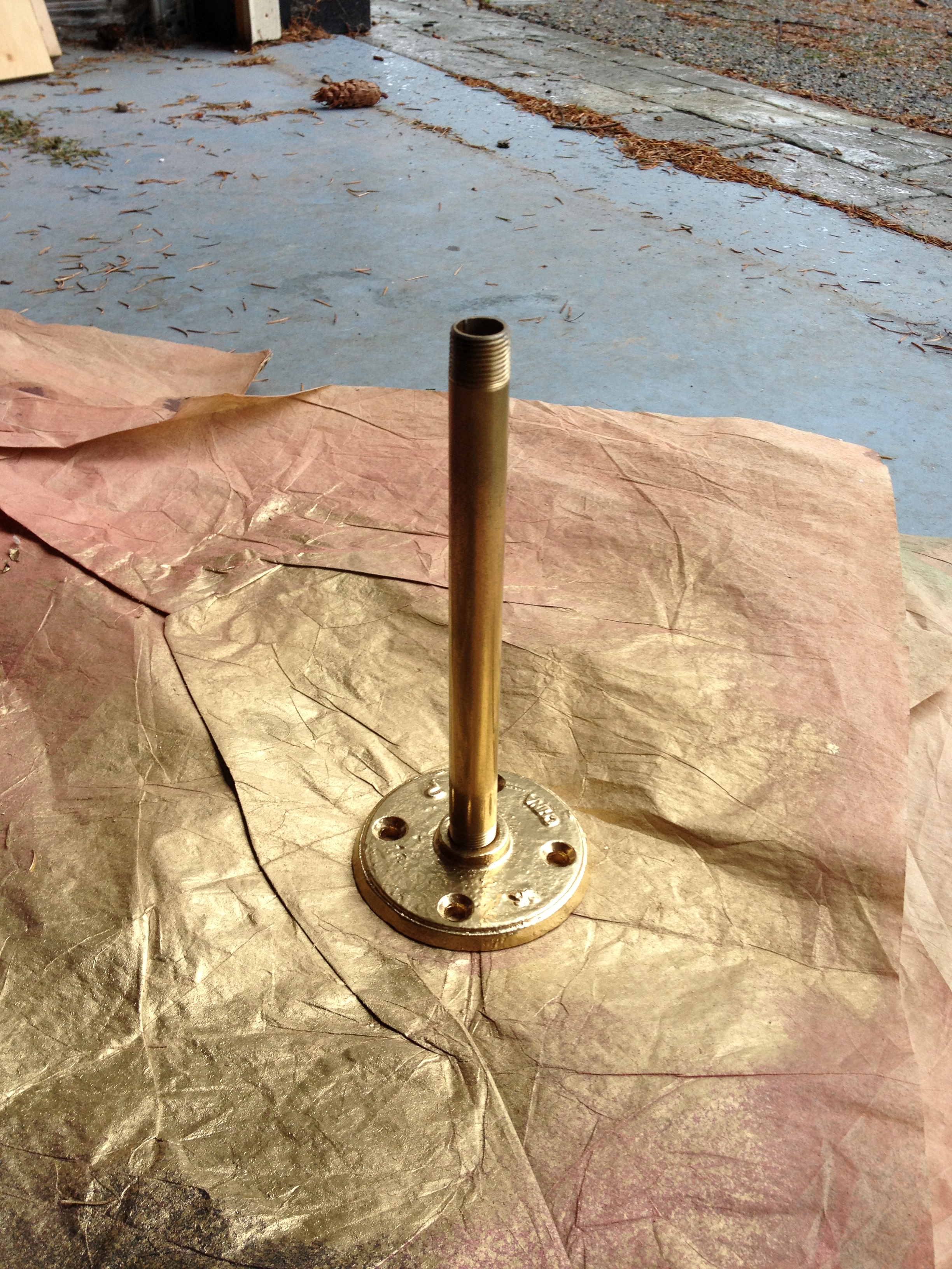It’s pretty simple, just screw the flange and nipple together. You might need a little WD-40, and if so, make sure you wipe it down well afterward so the spray paint will look nice, which leads us to the next step of stray painting it gold.