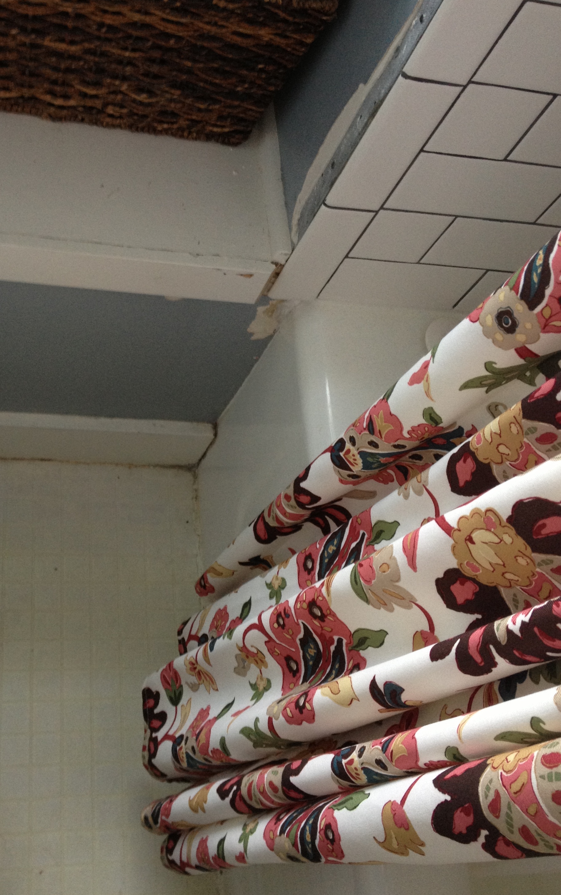 And I’ve been hiding the damage done from the bathroom tiling behind the shower curtain. I didn’t want to patch and paint until I finished the floor so that I could do it all at once…plus it’s a good reminder that I need to get on it!