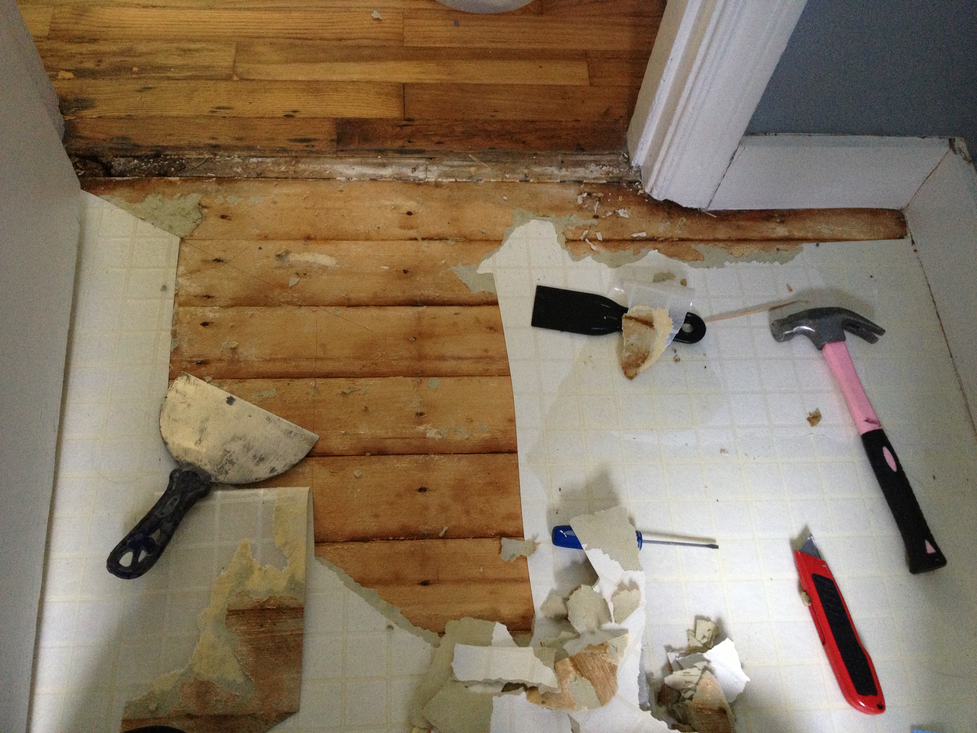 But it’s just got to happen, so I just decided I would start pulling up the floor. I’m starting at the door, and will do the toilet absolutely last. I will only take out the toilet once I realize what I am up against. Once the toilet comes out, I basically just have to work on the floor straight until the new one can go in. Each time I think about it, I decided I need a drink. Turns out it’s a very unproductive way of doing things!