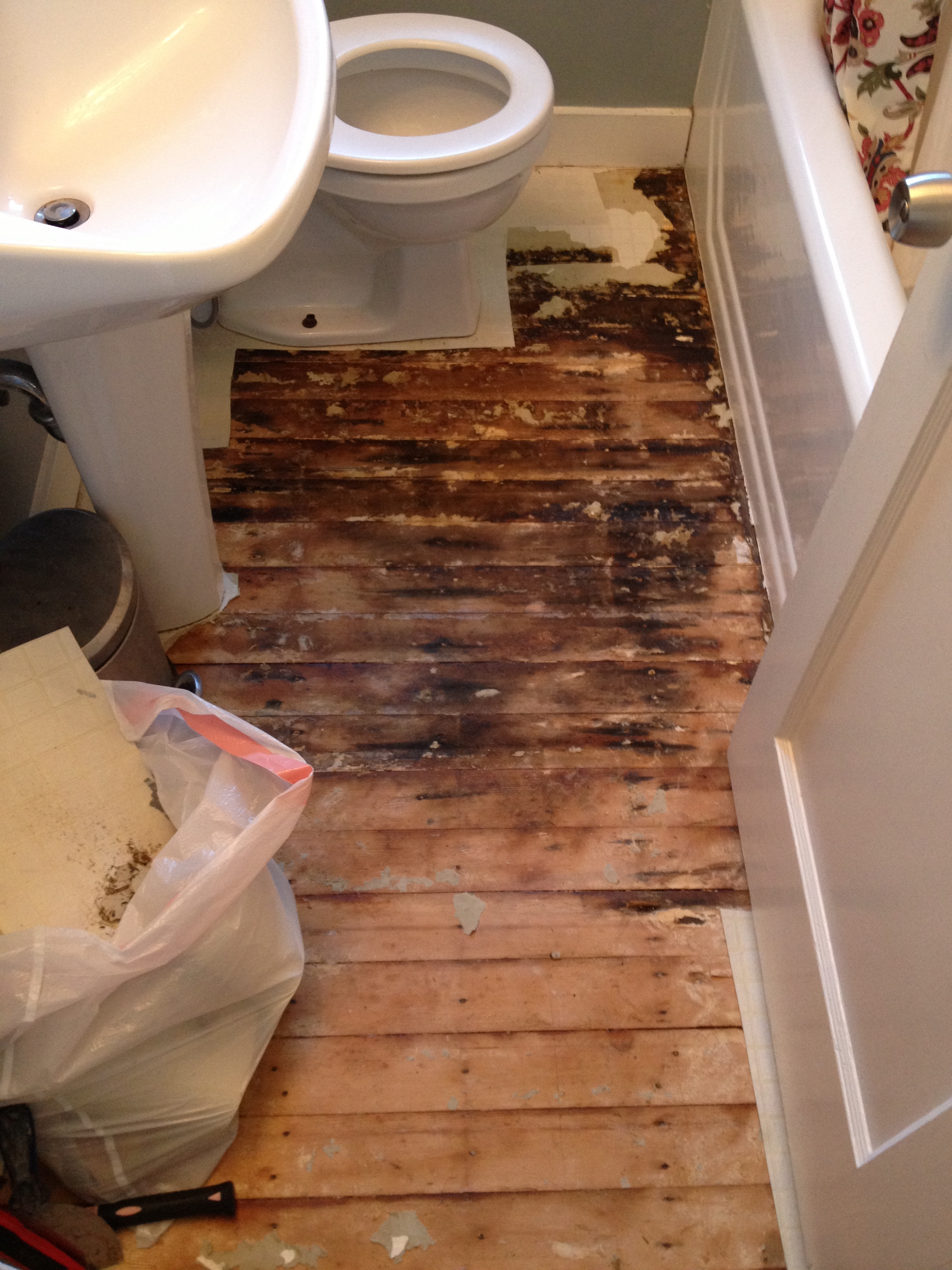It’s in pretty good condition. There is one small spot that I have found SO FAR that is rotten behind the door. It was a great sweeping hole :) I’m a little nervous for what I will find as I work my way along the tub and get to the toilet.