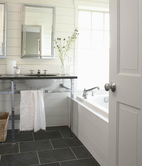 I love the large rectangular tiles running the width of the bathroom. Our bathroom is only 3.5×6.5ft, but I think the dark tile will add a dramatic bold element, and will set off the tile and the white pedestal sink and toilet. Our current floor is a yellowed linoleum.