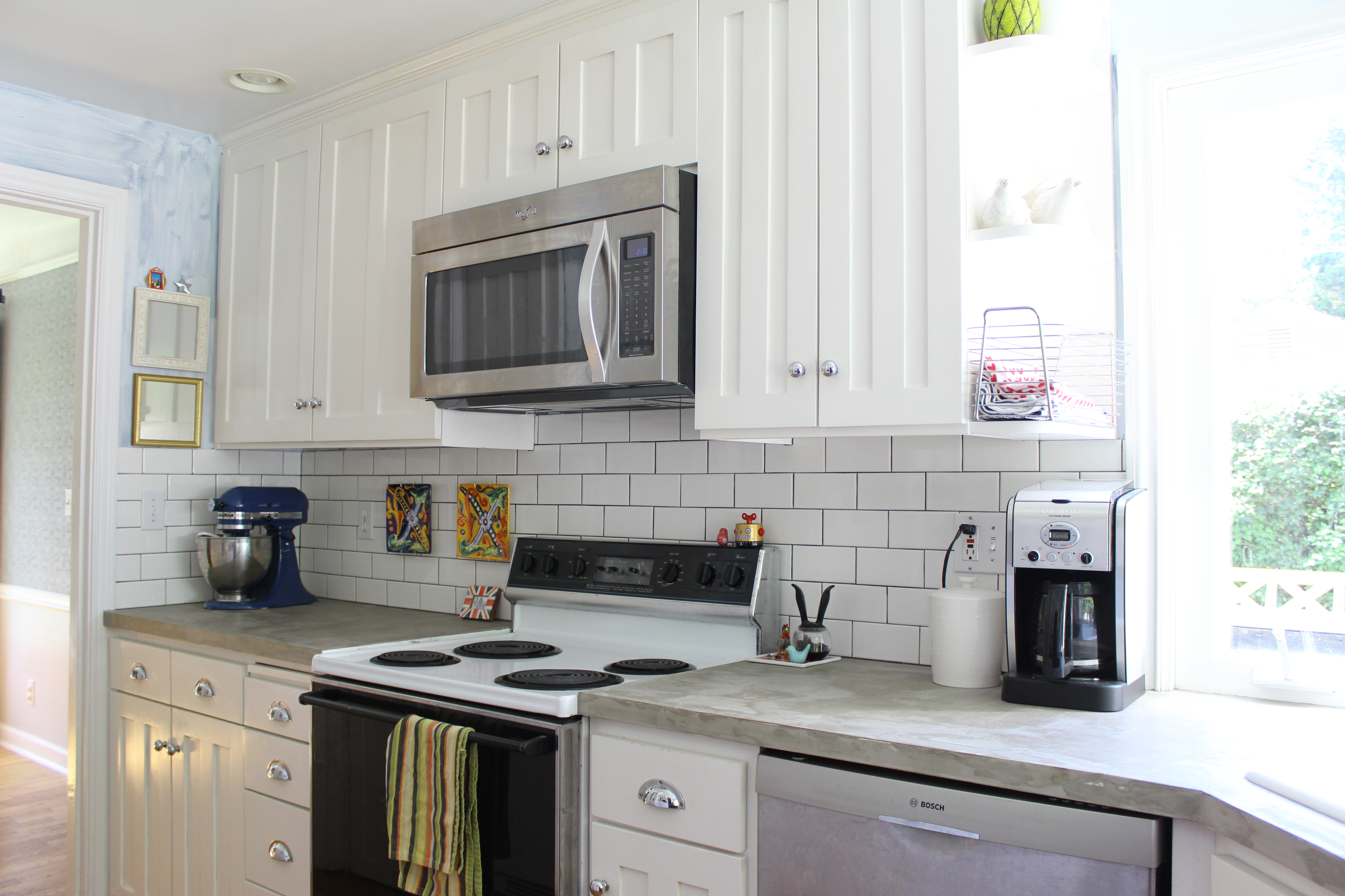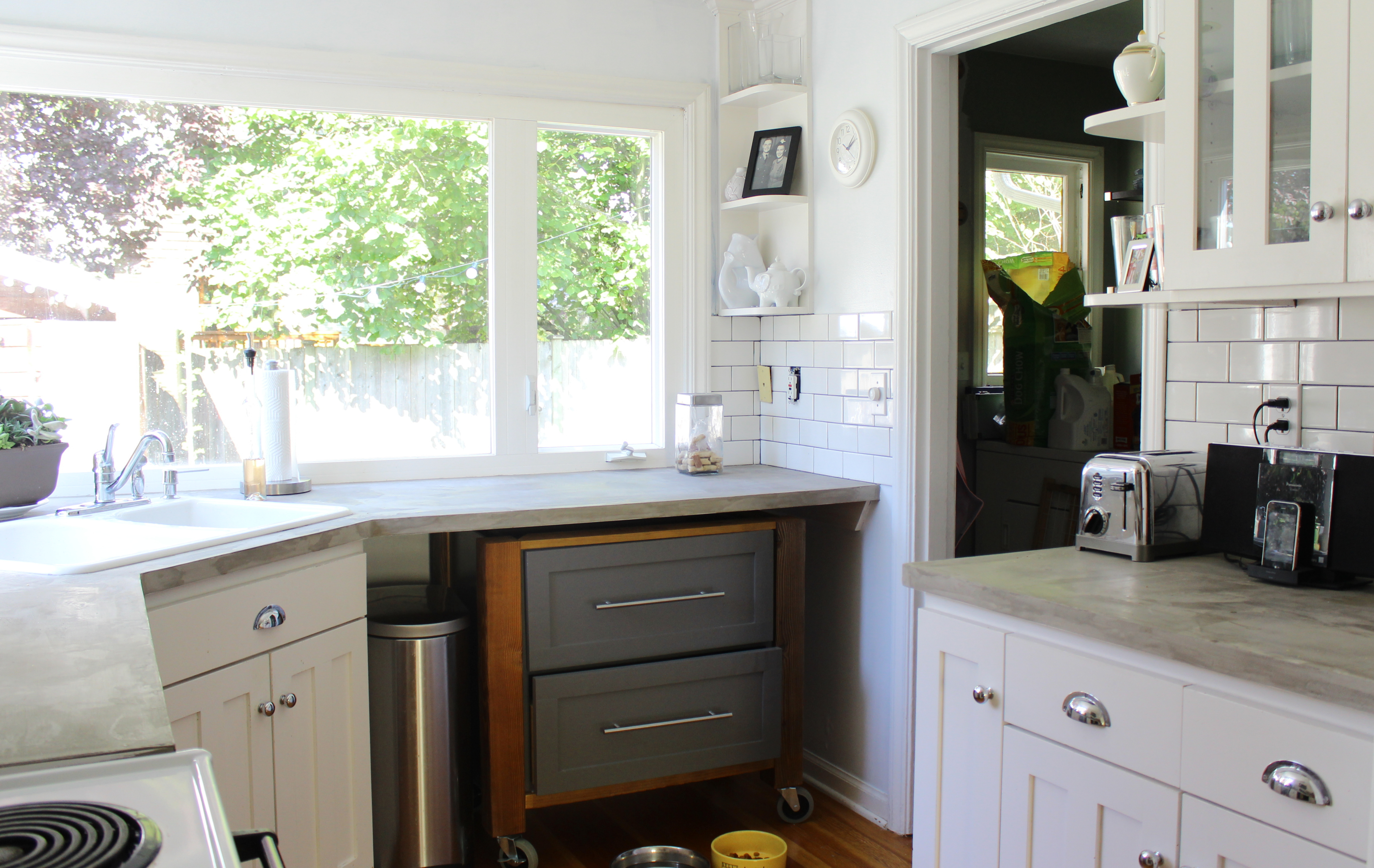 I wanted to keep the wall paint light, and looking at my pinterest boards the common theme was white. That then of course leads to the next question of what shade of white. I picked a white that had a little grey mixed in. I had hoped that it would help pull in the concrete counters, but instead a few other issues arose. First – I can’t help but feel like it looks like primer. I should point out that I only painted the wall in the photo below. The wall in the photo above does, in fact, only have primer. And second – the white of the walls is too white and makes the trim look dirty. I have to say though, the pictures make it look better than it is.