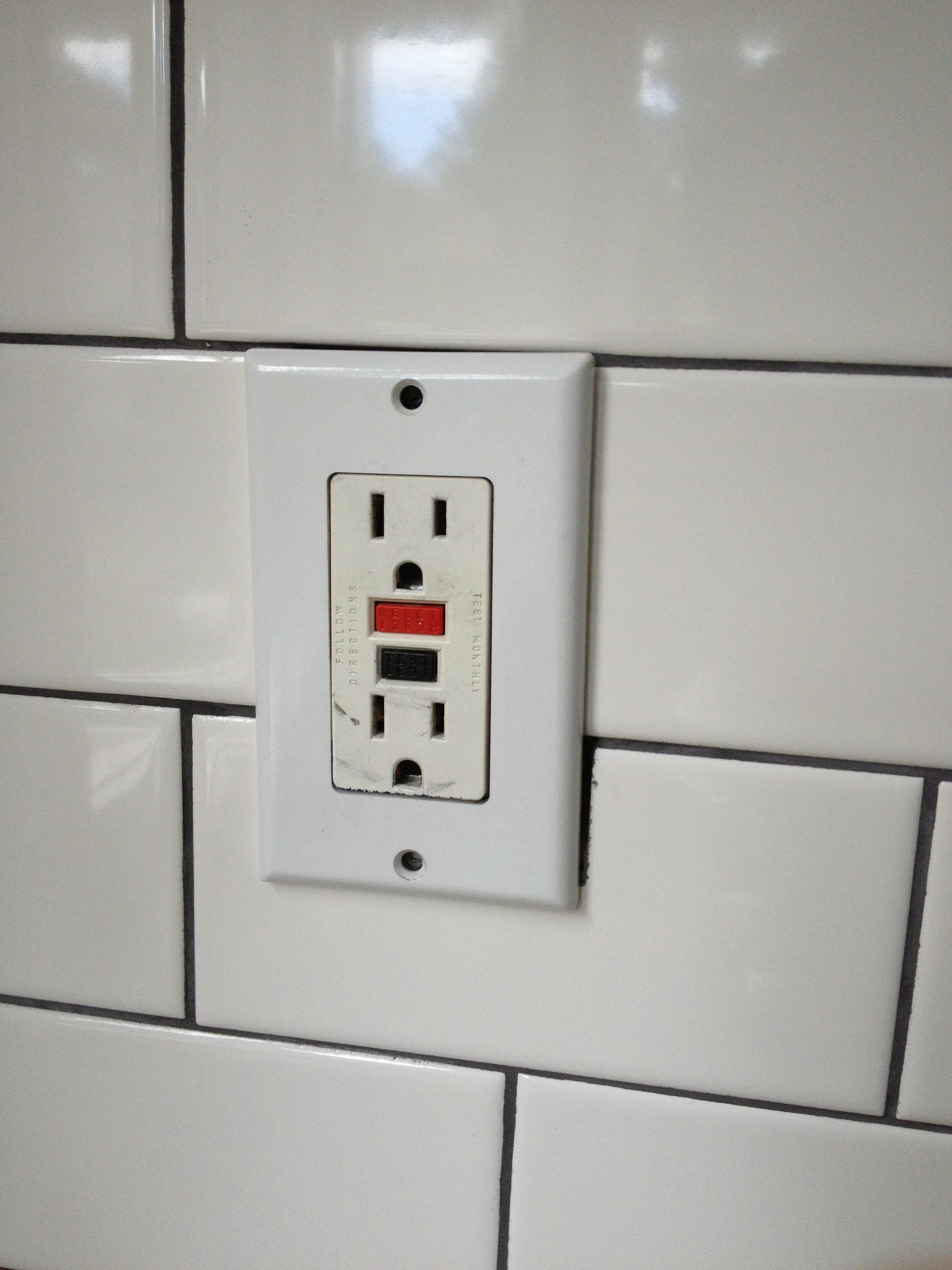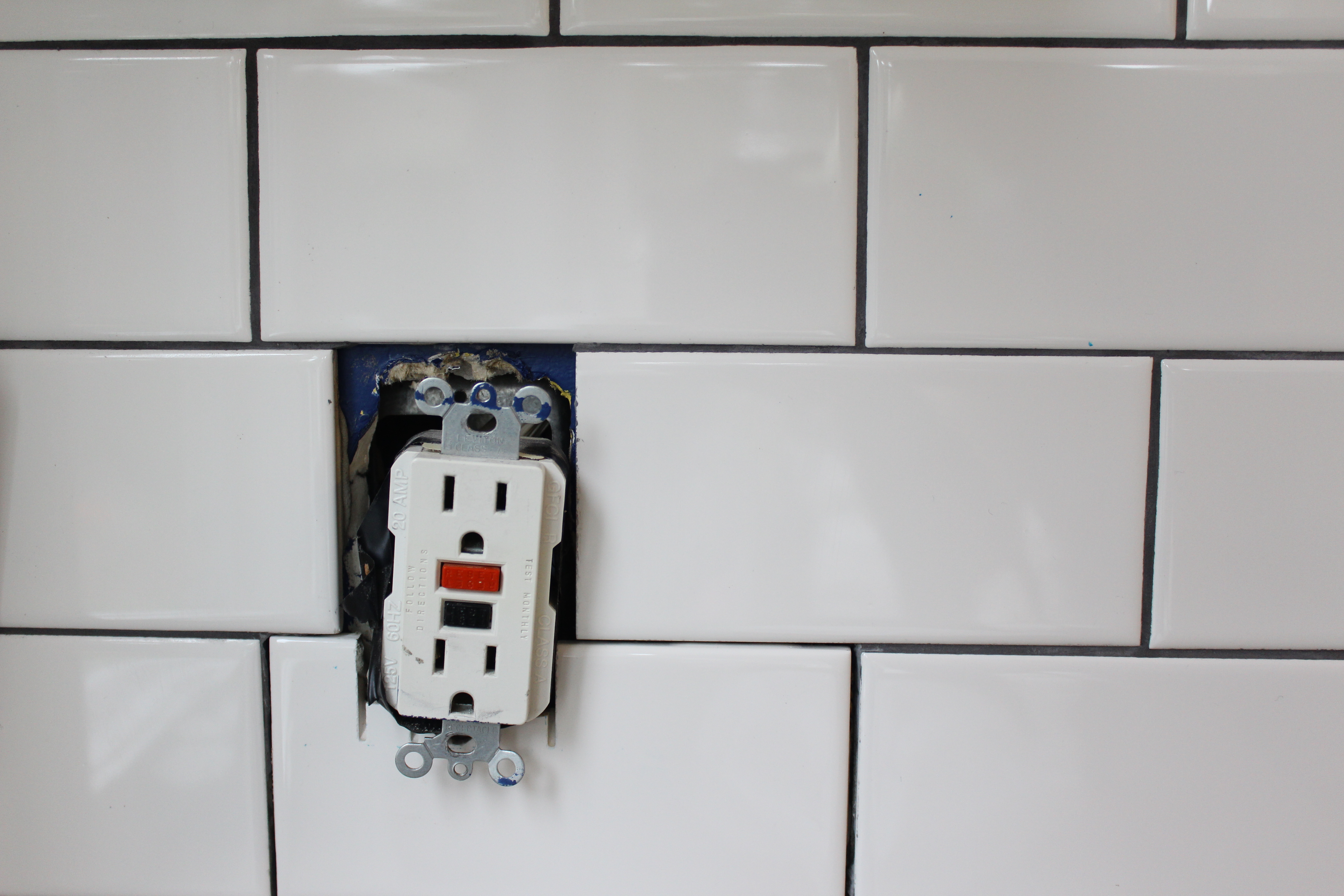 I did have a big set back as I was replacing all the outlet covers. You can see in the picture below, there is a small gap between the cover and the tile! I seriously was about to scream. My tiling supplies had been put away for over a week, and I had no interest in getting them back out. And that type of cut is a huge pain. But I know that it would haunt me if I left it. It would whisper my name each time I’d enter the kitchen, and I would try to look away, but I’d just stare. So to nip that, I replaced the tile. Luckily I still had the tile cutter and had yet to return my tile surplus.