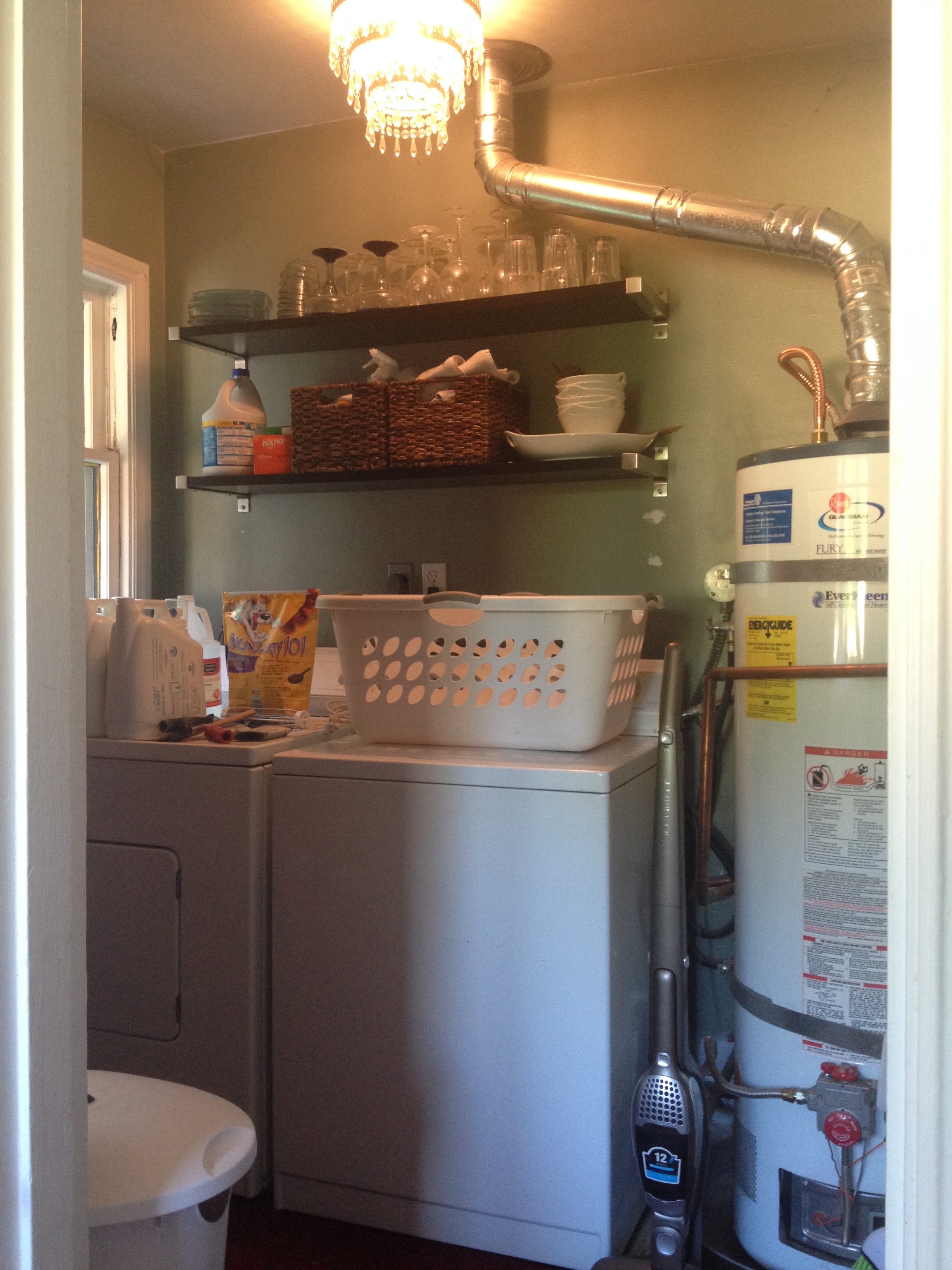 And then hopefully once the deck it complete we can add a counter over the washer/dryer and put some proper storage above. While I love the open shelving, I’m hoping to get some dining room storage that those can move to, and we can do some upper white cabinets for cleaning and dog supplies.