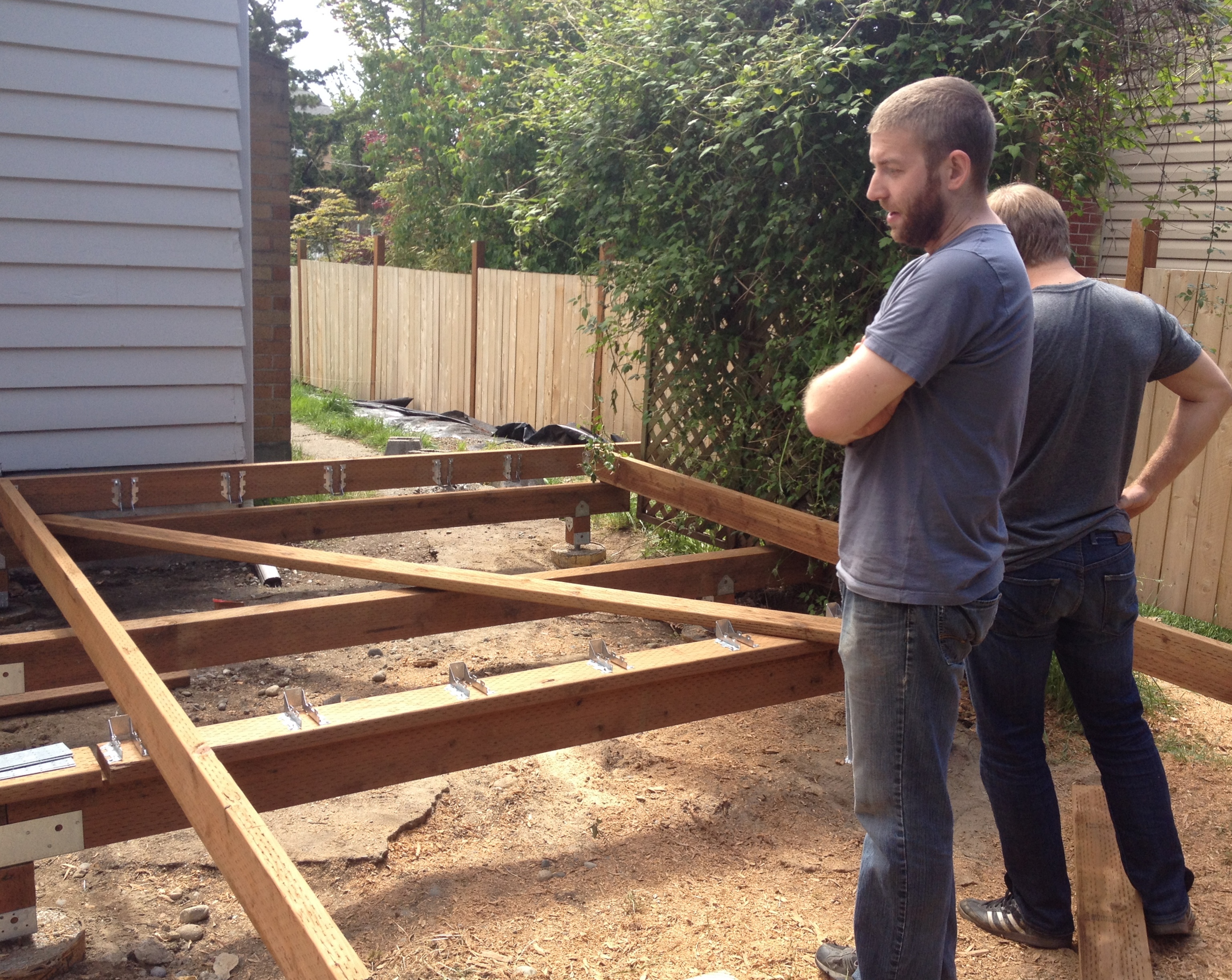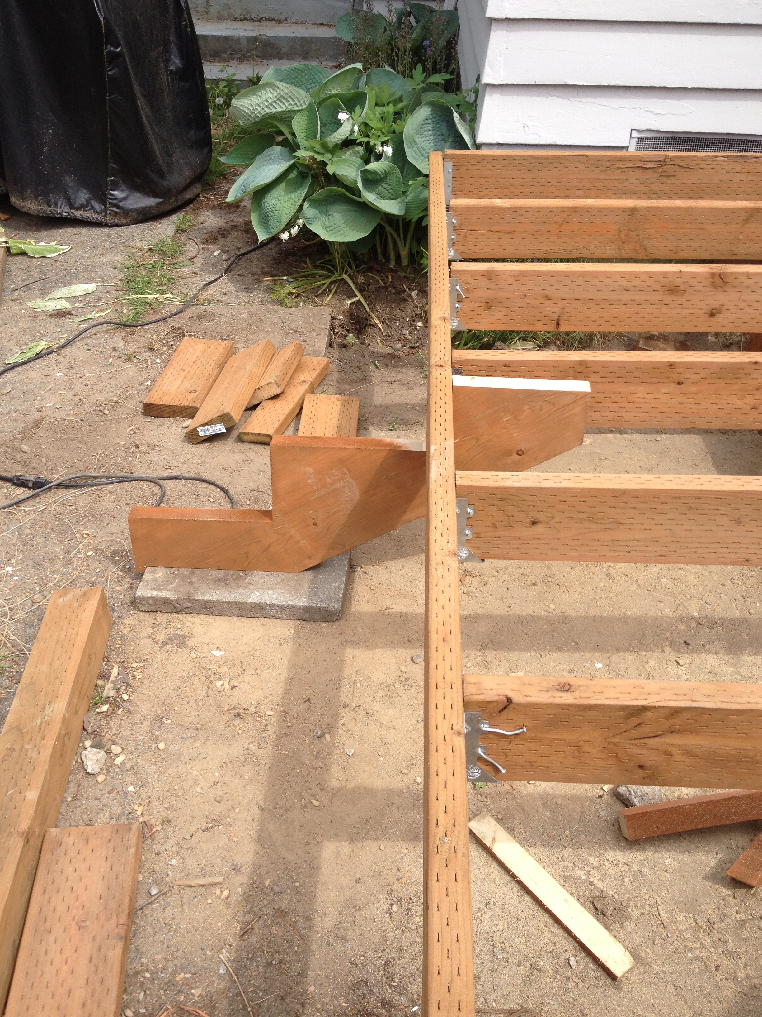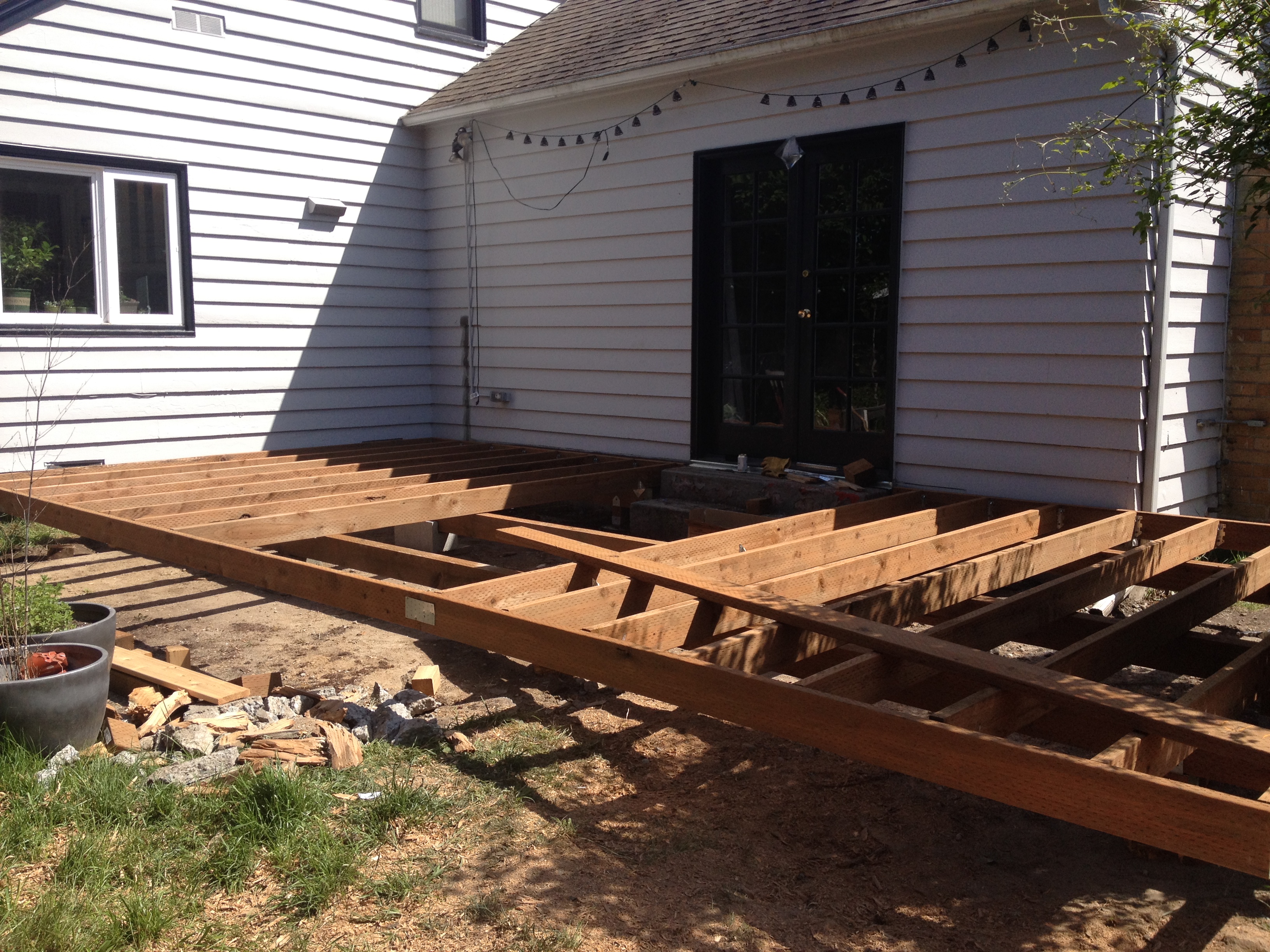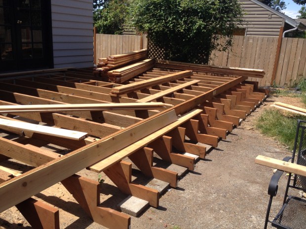 Here is a long string of process photos, if you are at all interested in the long painstaking process of building a 16×25′ deck! With a little commentating in between.