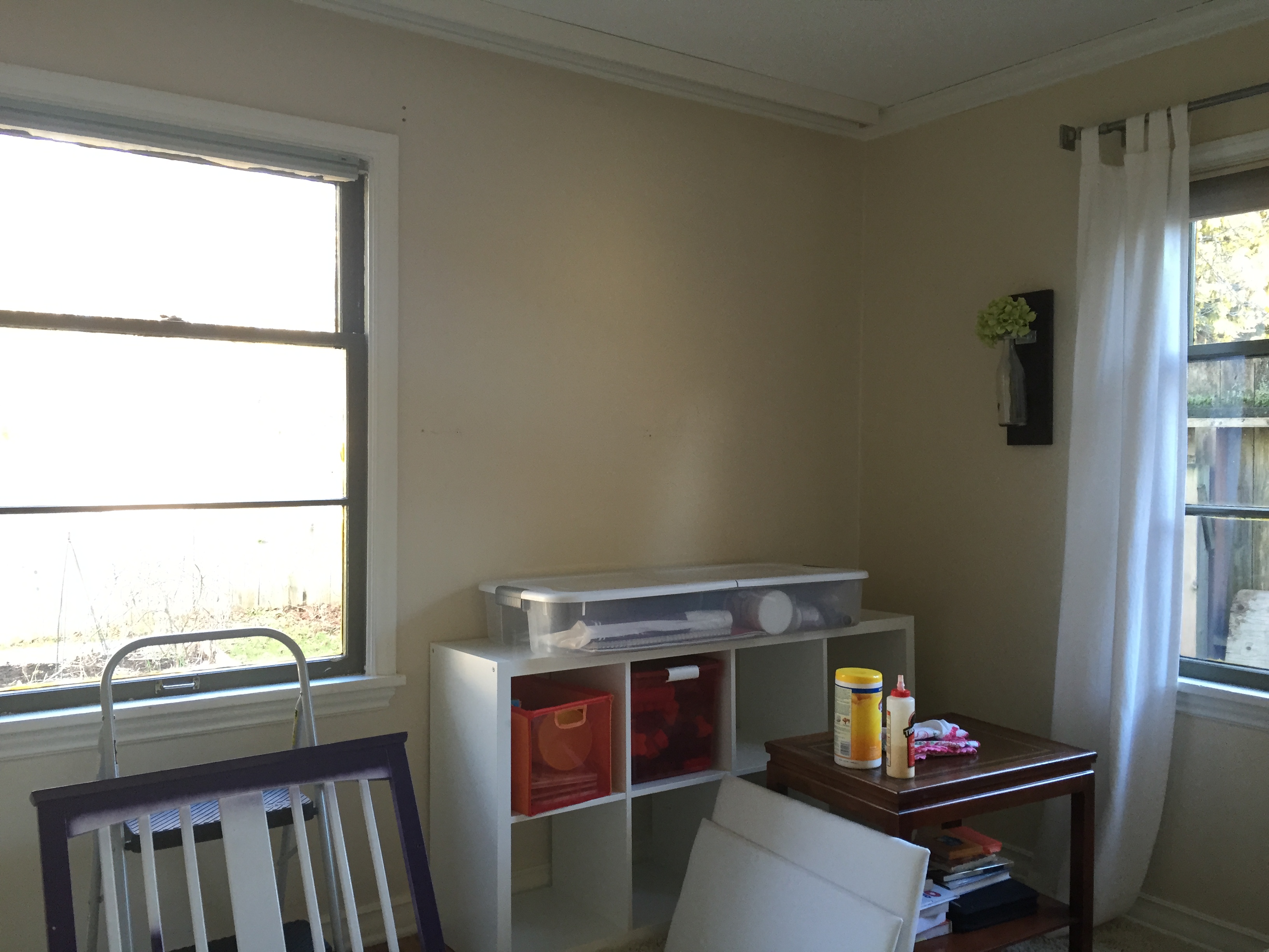 The room feels so light and spacious without a huge queen bed in the center. We are waiting to move her in until we can replace the windows. They are painted shut, are not sealed making the room about 5-10 degrees cooler than the rest of the house. I think that the curtain wall definitely helped insulate it a bit.