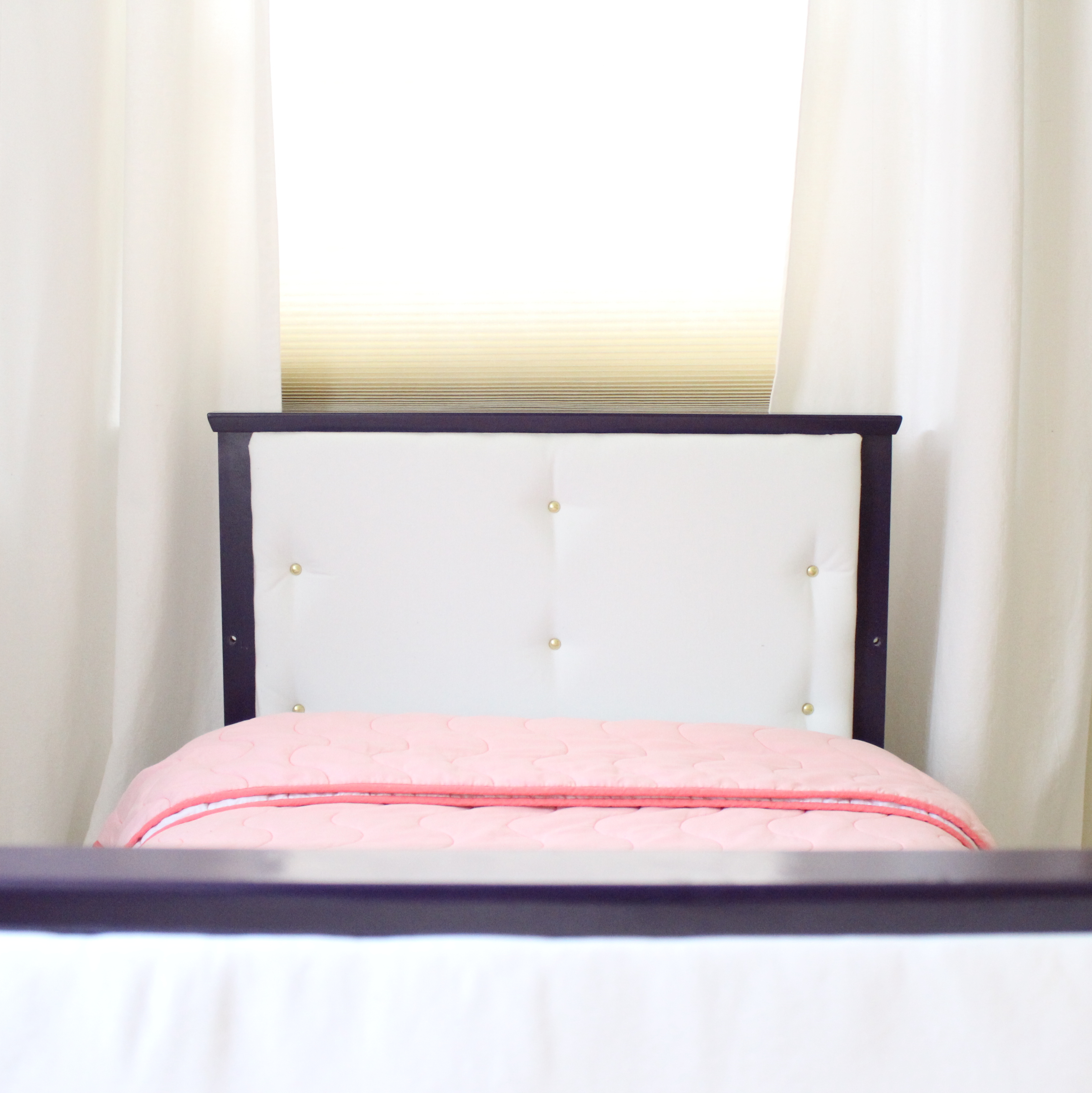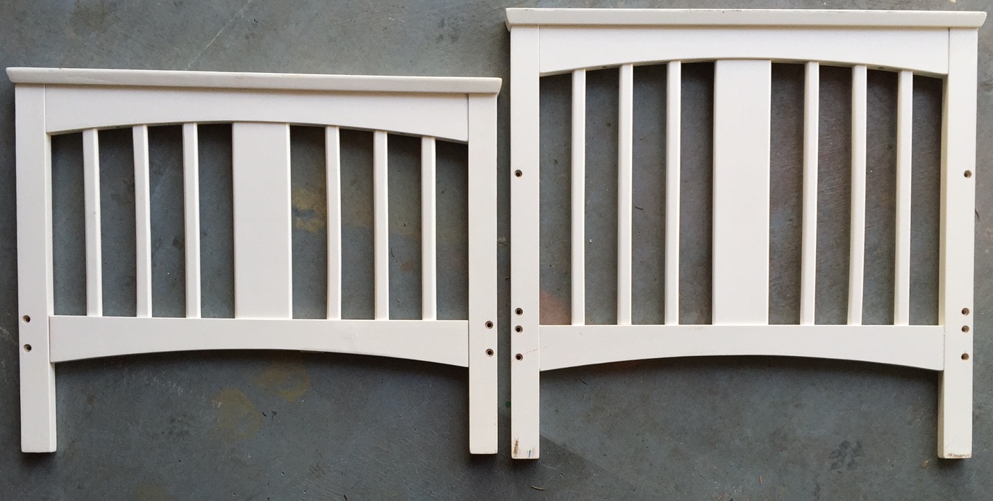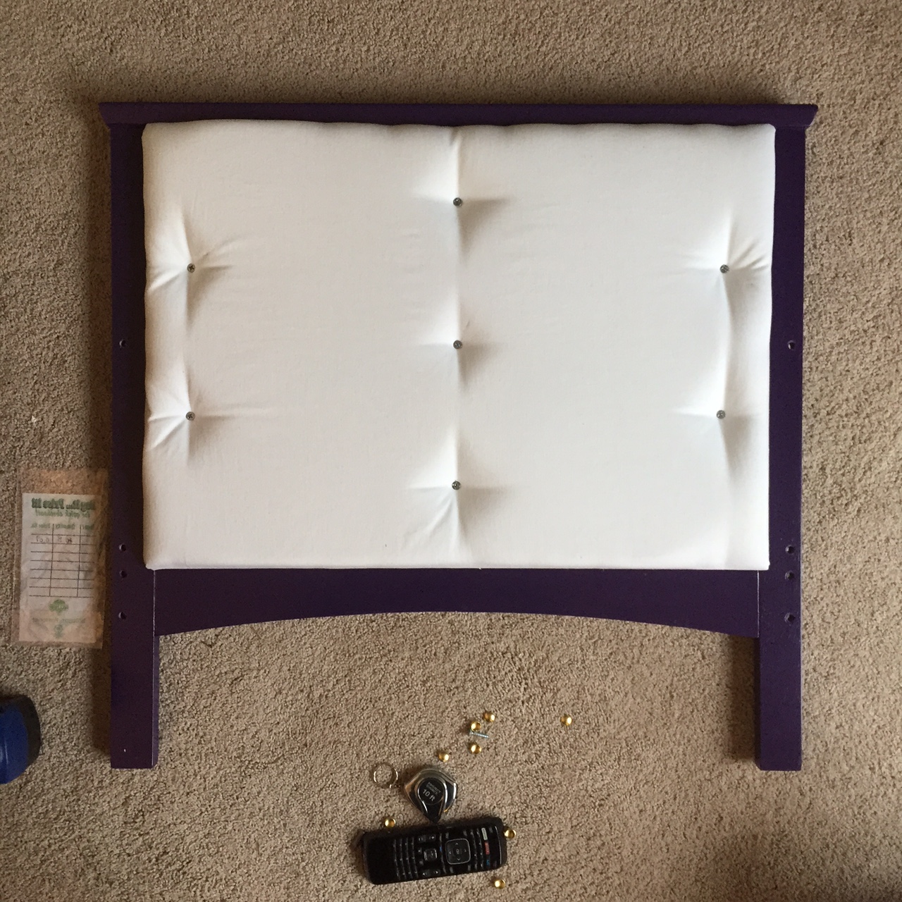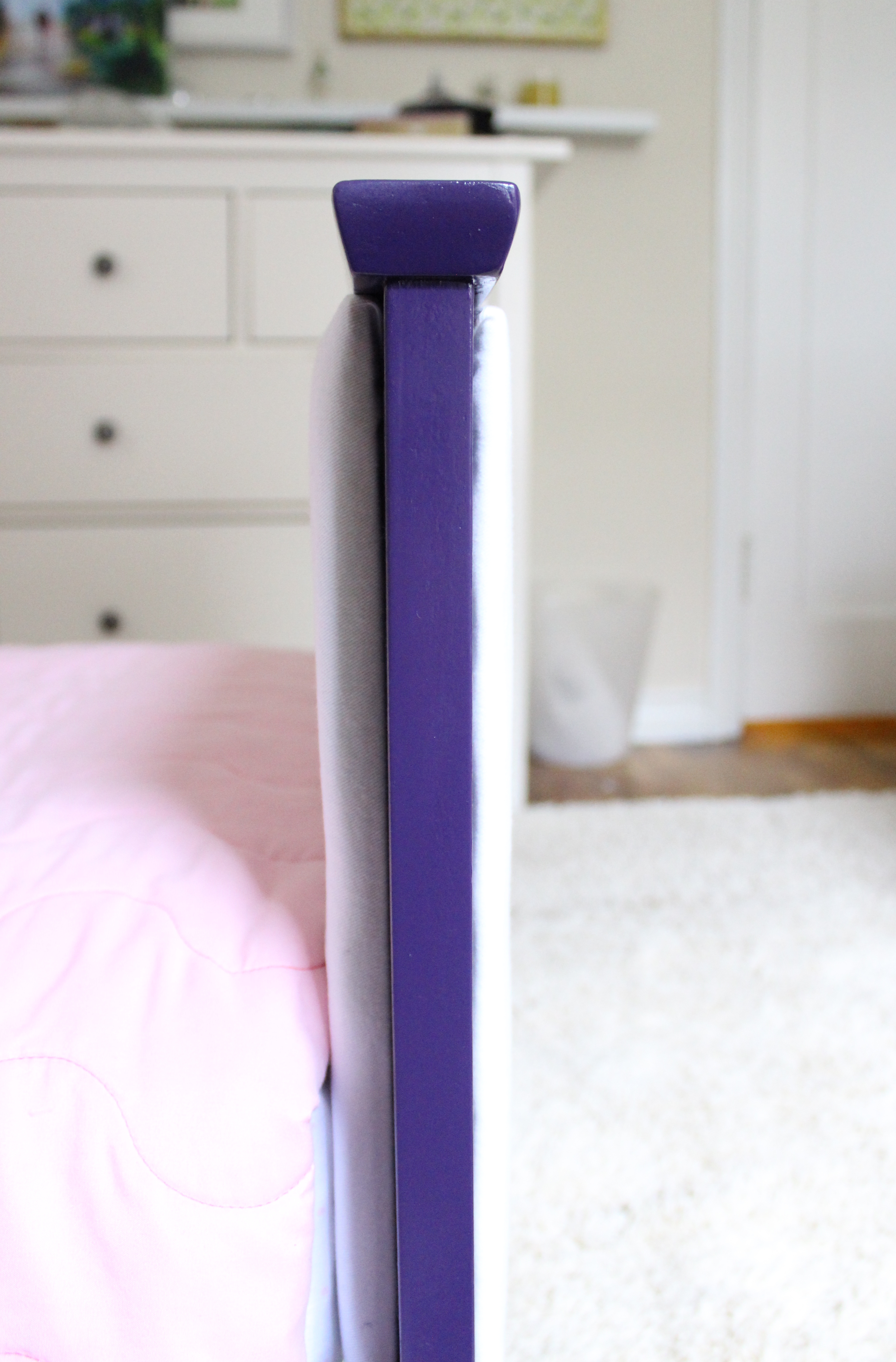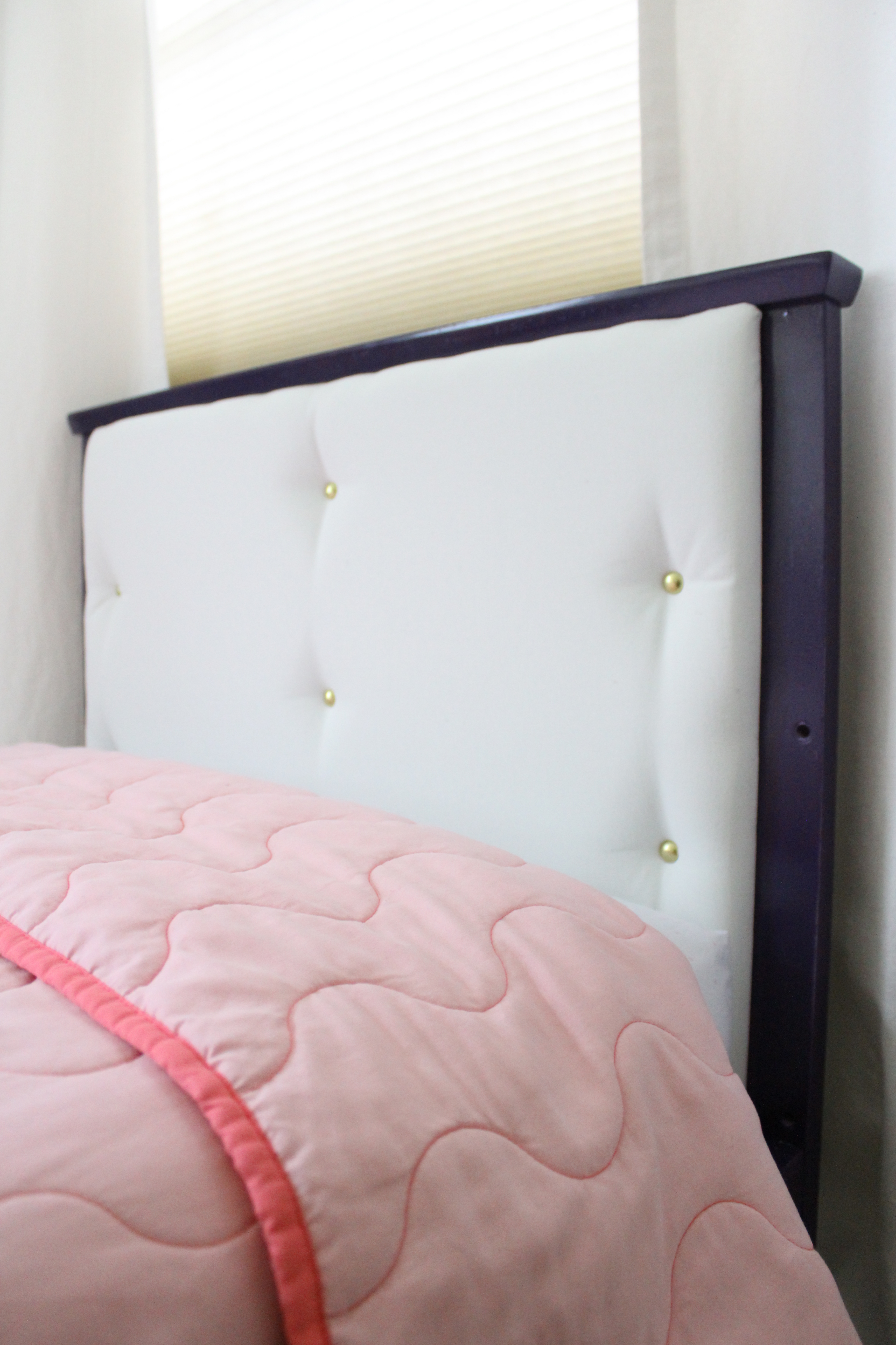 My aunt found this old white toddler bed at a neighbors garage sale. It’s a perfect size little bed for Lucy, but I really wanted to jazz it up a bit. I thought something with color, and something different. I kind of like the look of a tufted bed. For a toddler it seems a little ridiculous, but I think that’s why I like it…out of the ordinary. This is the before of the bed frame.