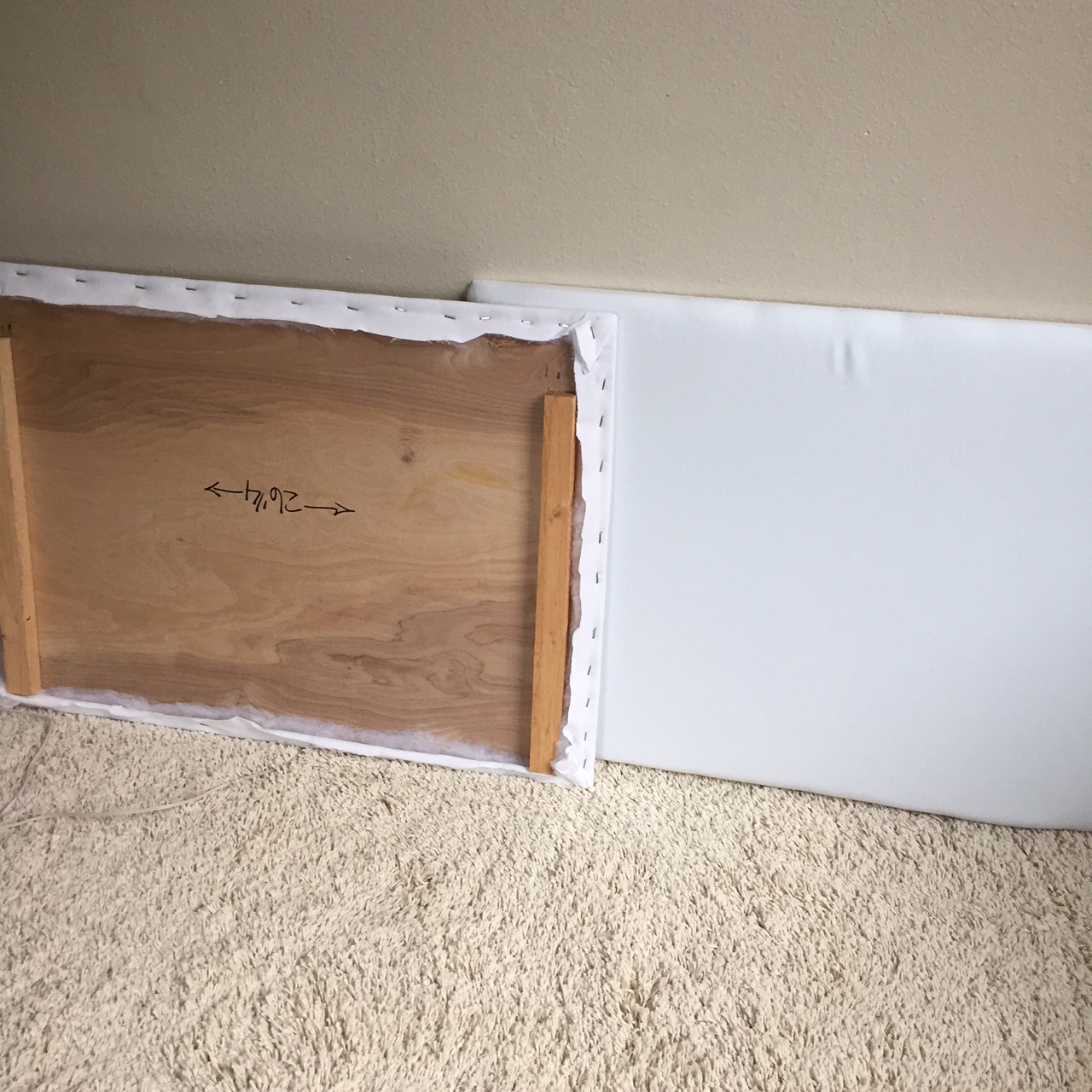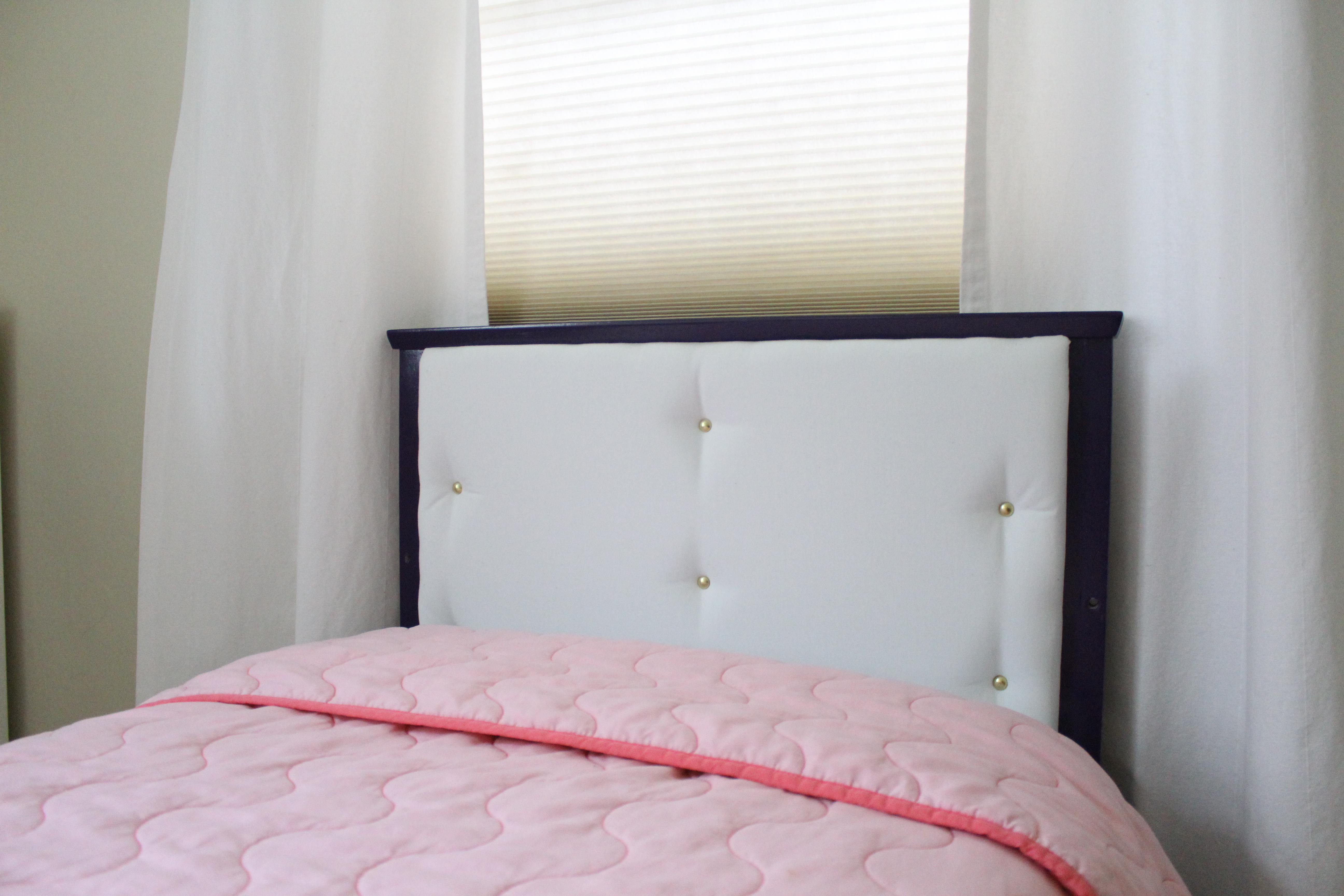 I cut some 1/4in plywood that I had in the garage to cover the bars. I upholstered each piece. The head board has 1 inch foam, and the foot board has 1/2 inch foam. I covered with a heavy white cotton from an old ikea curtain panel.